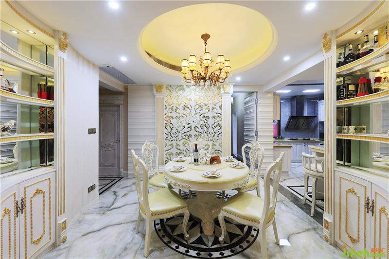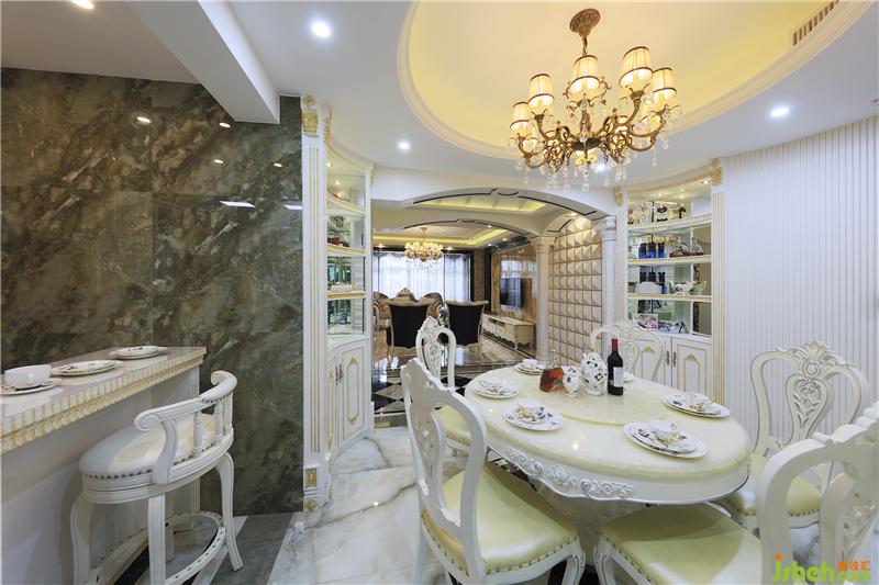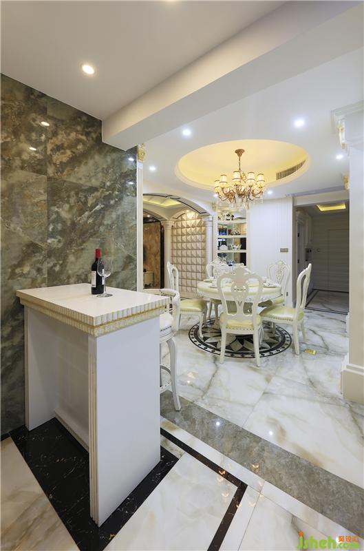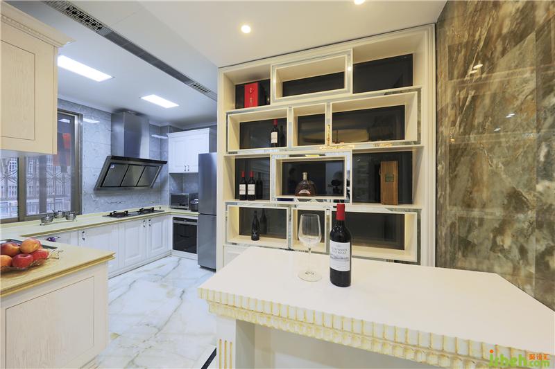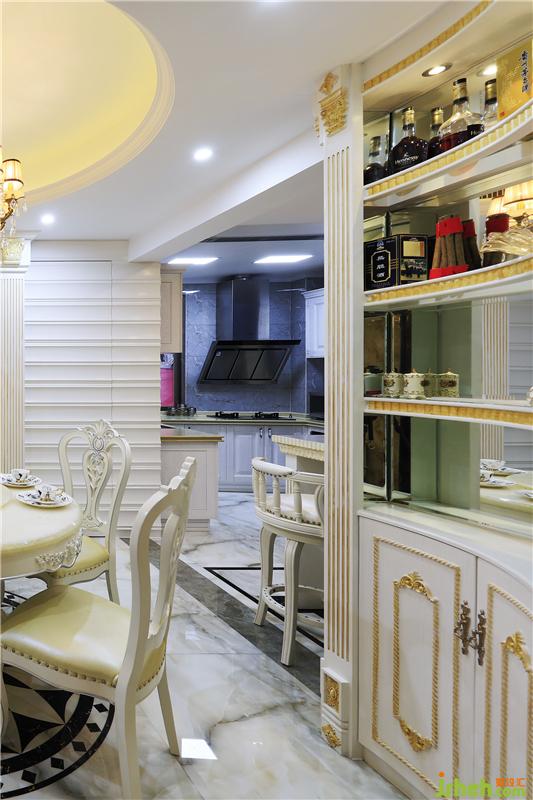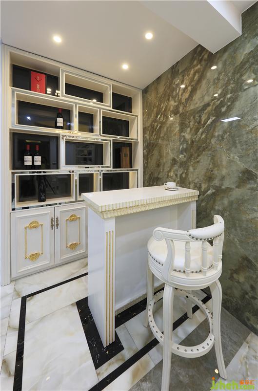 吧臺(tái)連接著餐廳、廚房,各區(qū)域看似相連實(shí)則分隔明確,動(dòng)線流暢通透。地面磚鋪貼造型與吧臺(tái)造型相呼應(yīng),透著清凈爽利。經(jīng)典的歐式酒柜讓整個(gè)空間更添典雅。室內(nèi)設(shè)計(jì)師設(shè)計(jì)吧臺(tái)座位不多,也可以當(dāng)做餐桌使用,大面積的亮色讓空間充滿時(shí)尚感。
