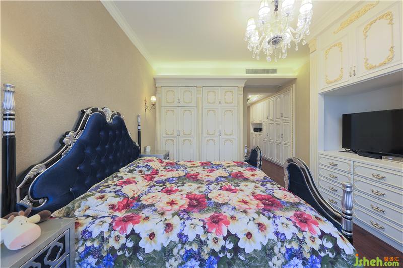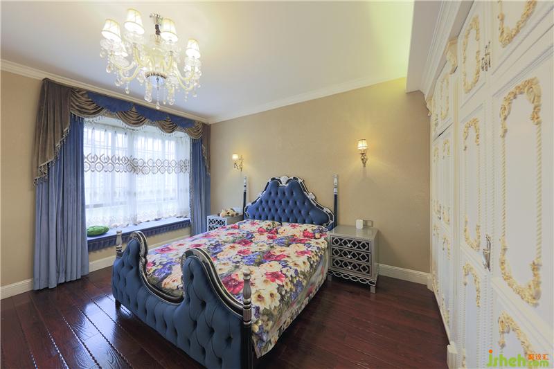 主臥室床頭床尾優(yōu)雅的藍(lán)色軟包裝飾,在低調(diào)中透露出奢華,質(zhì)感高級(jí)且富麗,流暢利落的線條帶來(lái)輕奢質(zhì)感,帶有歐式的古典韻味與風(fēng)情。精致的金屬水晶藝術(shù)吊燈、極具復(fù)古奢華感的絨布窗簾、鋪陳歐式花紋的木飾面,投射以情境光源,自然氛圍悄然流露,給空間帶來(lái)穩(wěn)重和懷舊的藝術(shù)美感。