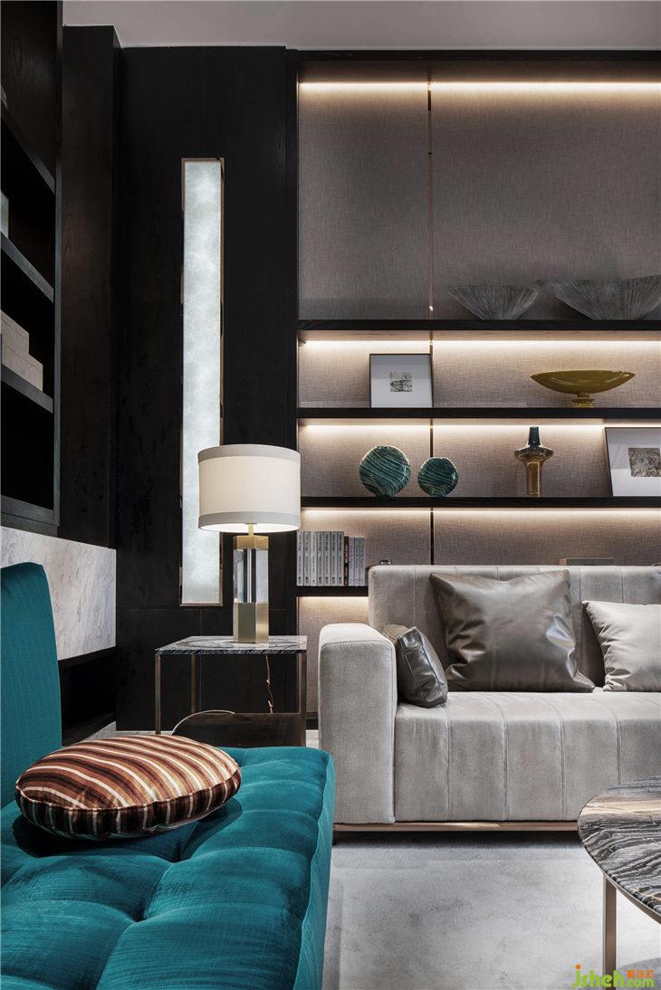 灰色石材,質(zhì)感的布藝沙發(fā),低調(diào)而高雅的材質(zhì)烘托出無壓迫感的氛圍。