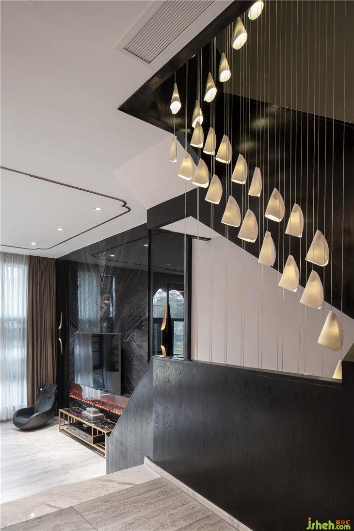 光是唯一能使建筑成為藝術(shù)的,手工定制藝術(shù)吊燈的暖光透過陶瓷薄片,溫柔光影變化,賦予建筑形態(tài)樓梯別樣意義。似是將造物主的那束光射向觀者心房,