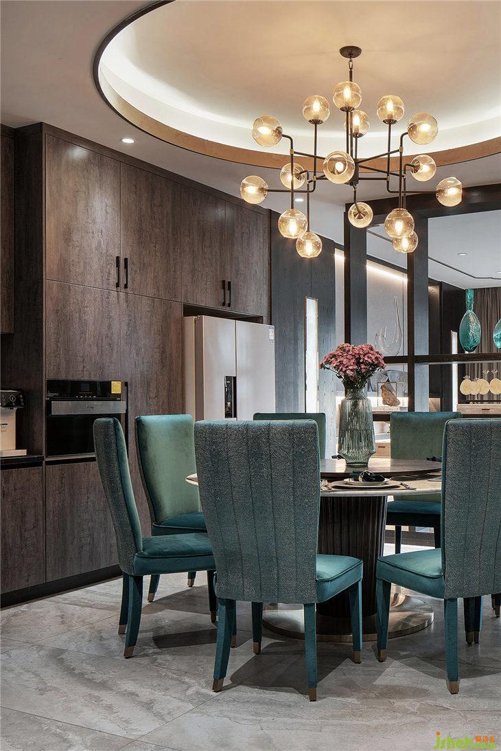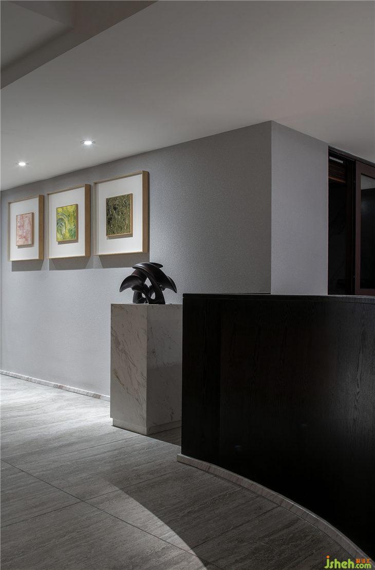 在陳設(shè)設(shè)計(jì)上,通過挺闊的輪廓線條和大氣的造型呼應(yīng)并加強(qiáng)了某種藝術(shù)性的散發(fā)審美。深色木飾面的色調(diào)圍繞空間,下沉式客廳帶給你包圍式的放松。
