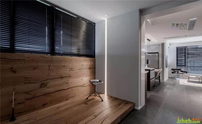 進(jìn)門(mén)本來(lái)是入戶花園,后期內(nèi)包成室內(nèi)的一部分,地板上墻還做了地臺(tái)。這是主人進(jìn)戶,換鞋、整理的過(guò)渡區(qū)域。