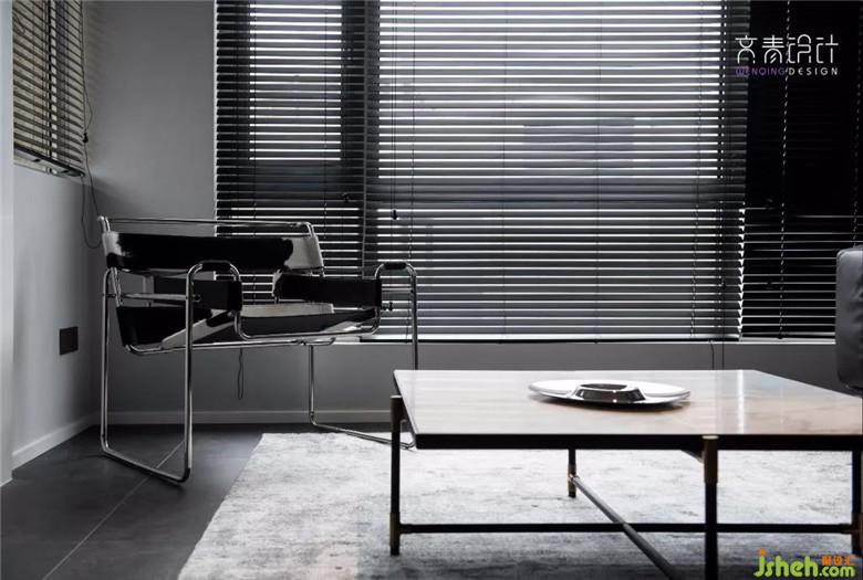 窗簾是少見(jiàn)的黑百葉簾,代替普通布質(zhì)窗簾,不論陽(yáng)光或是用燈光,光線都可以比較適宜。主茶幾買(mǎi)自線性公園。