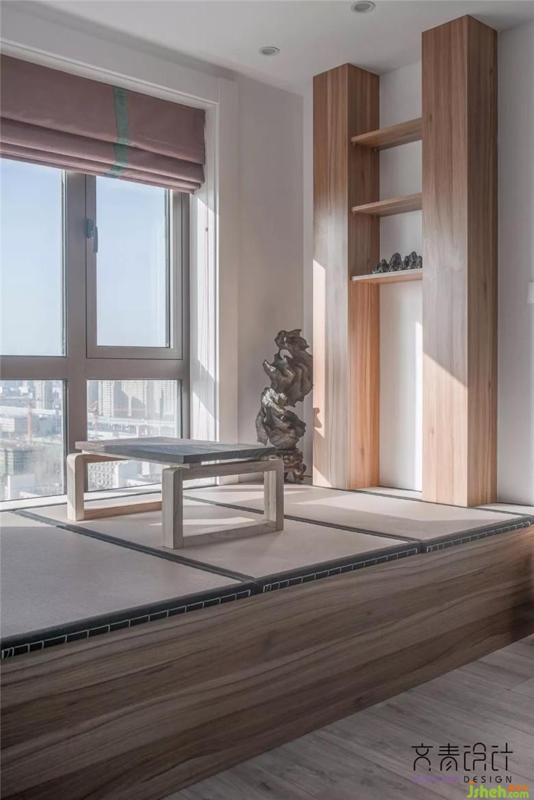 左側(cè)是條型的電腦辦公桌和整面的書墻,也可以放置男業(yè)主最愛的文玩收藏。右側(cè)是一片茶室榻榻米,西北朝向的書房,有兩面大窗,采光極好,夕陽西下時(shí),陽光會透過窗,灑在榻榻米上,感覺十分靜謐,又溫暖。