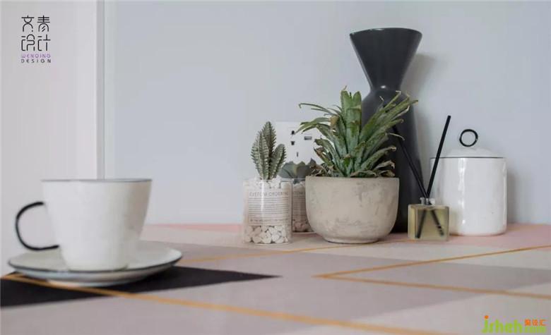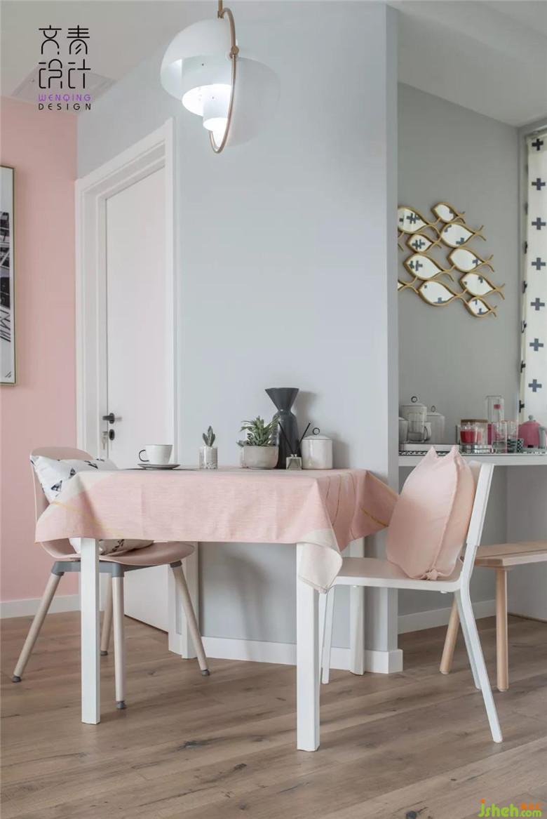 在這個可愛的小窩里,客餐廳依舊是緊密相連的,為了順應戶型的格局,餐廳的設計巧妙的采用了側(cè)切式的格局,餐桌緊貼著這塊斜方的墻面,這樣的設計既充分的利用了這片小空間,又不失美觀大方,營造出來的溫馨質(zhì)感瞬間圈粉,二人世界,燭光晚餐,突然有點甜。