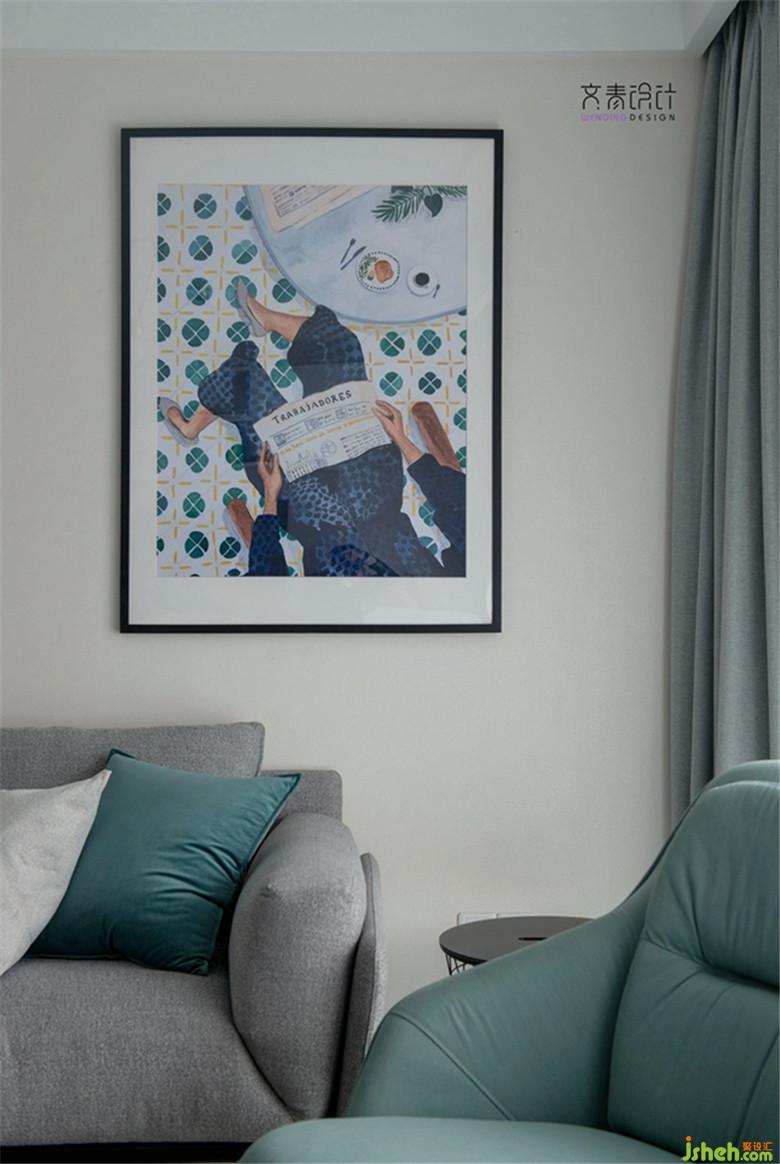 由于硬裝上沒有做改動,因此在家具、窗簾盒裝飾畫的選擇上,加入多色系的元素。顏色選擇上多用莫蘭蒂色調(diào),整體的飽和度還是偏低的,這樣整體感覺會更融洽。