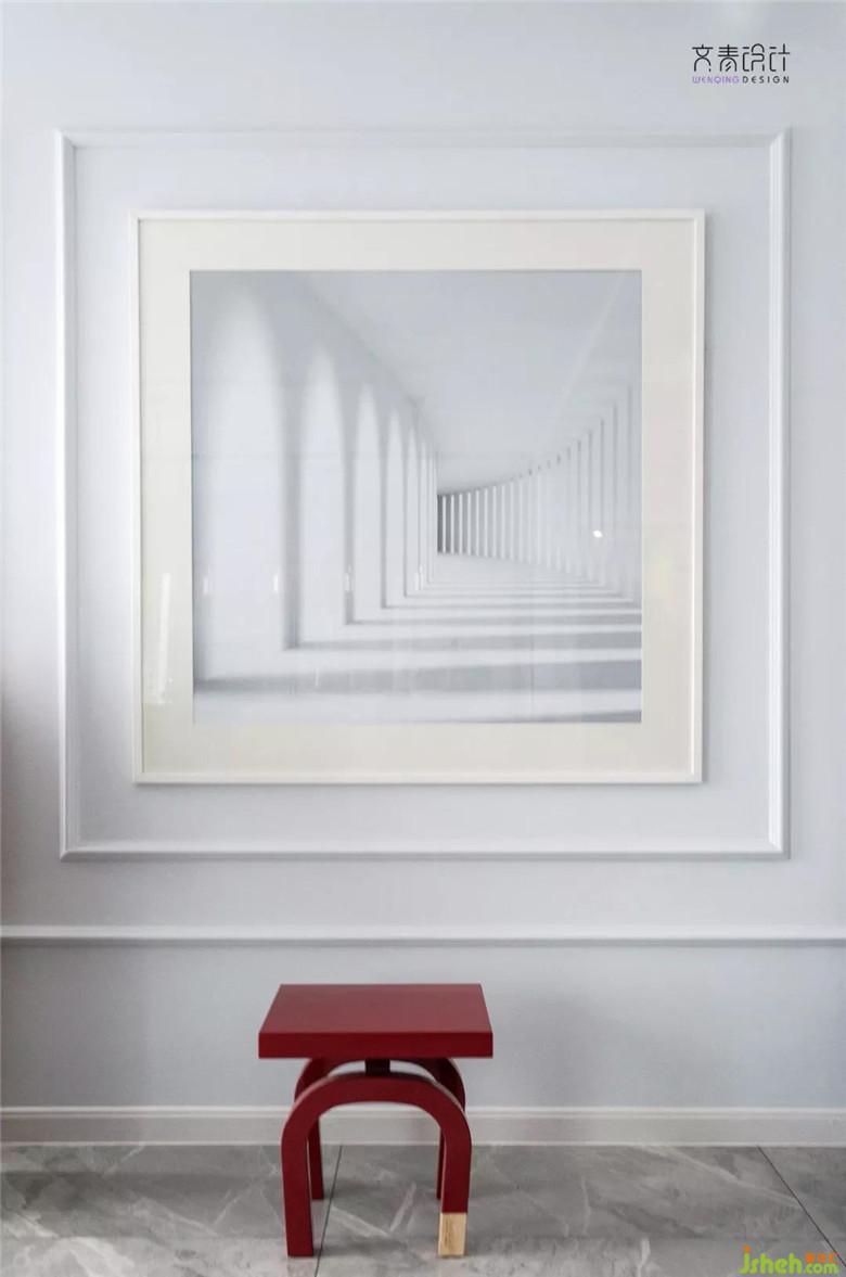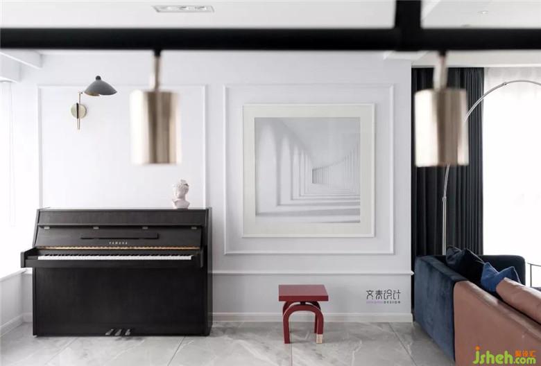 鋼琴背景墻,用石膏裝飾線條框景。掛畫十分有縱深感,框入有限的石膏線框,讓背景不死板更生動(dòng)。