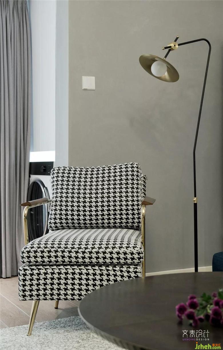 主沙發(fā)的藍(lán)跳出低飽和的框架,幾何紋路的地毯、蓋毯、抱枕與千鳥格單人沙發(fā)相呼應(yīng),不跳脫也帶小資的情調(diào)。