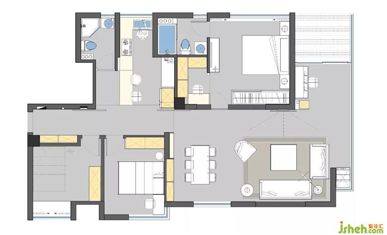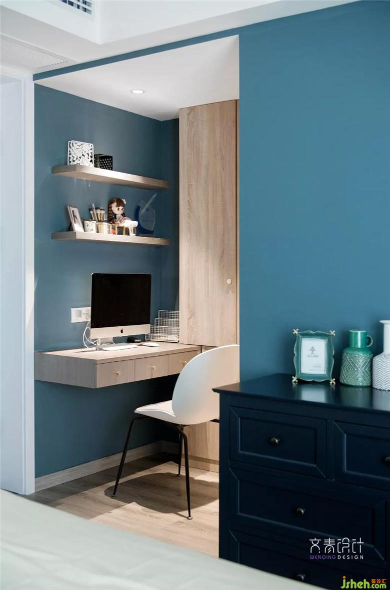 這更衣間兼書房的區(qū)域,原是衛(wèi)生間門過道。封閉后,衛(wèi)生間開到房間里側(cè)。利用這處原先浪費(fèi)的空間,打造成儲(chǔ)納和功能兼具的小空間。