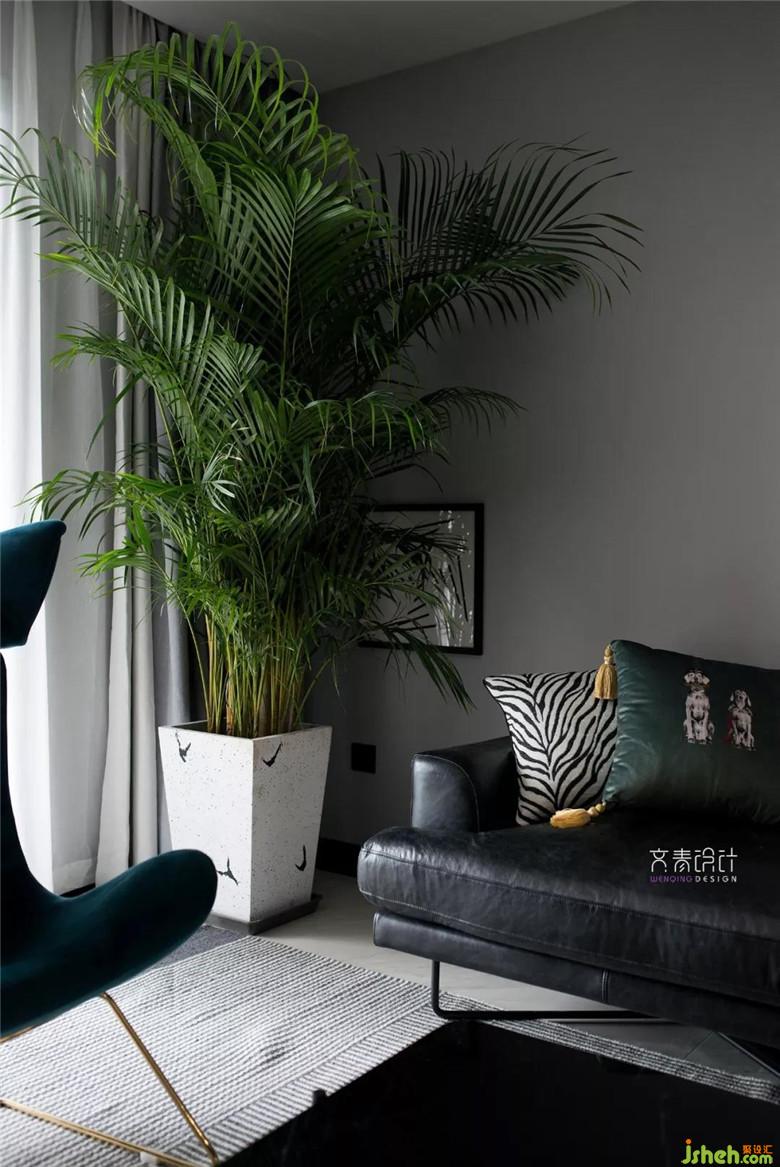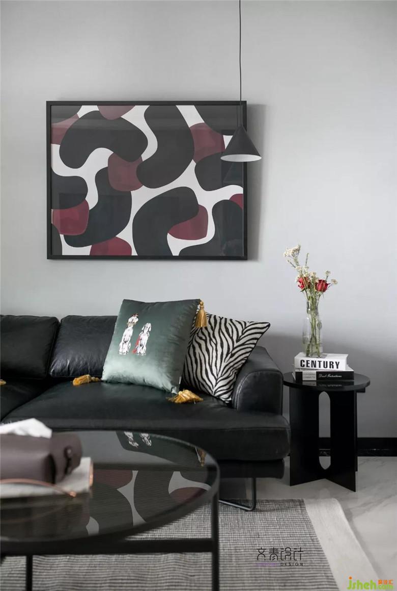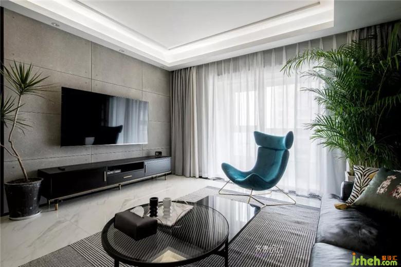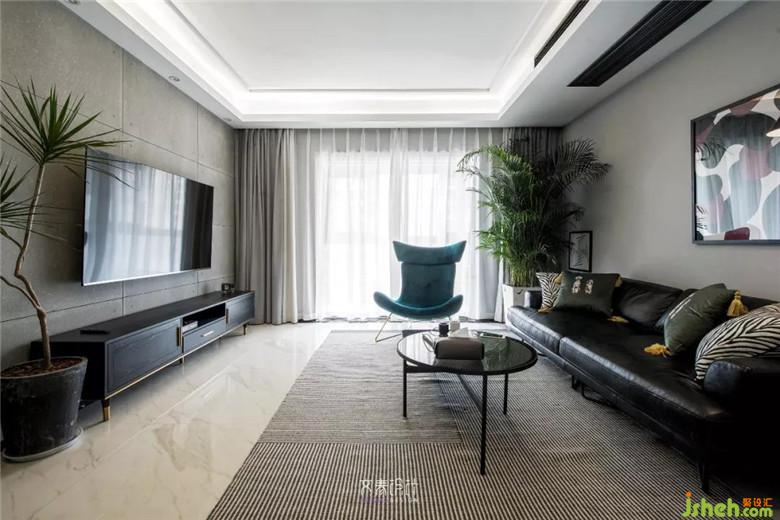 電視背景墻是原硬裝做的防水泥板墻,問題不大就沒做改動??蛷d空間整體搭配比較利落大氣,同時輔以綠植,掛畫,家具跳色細節(jié)點綴。