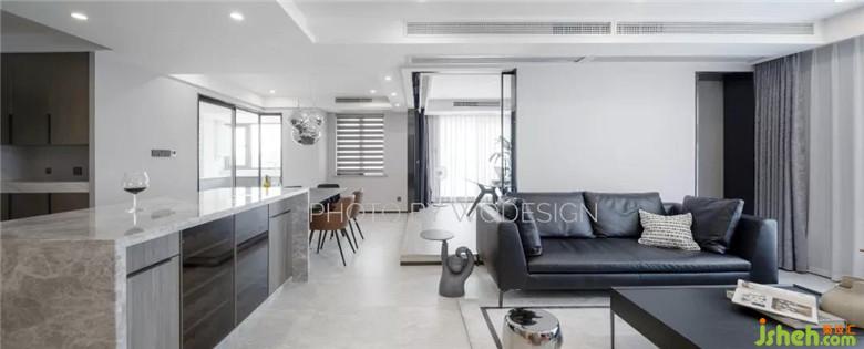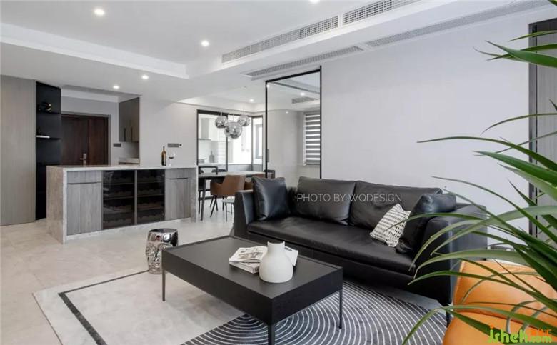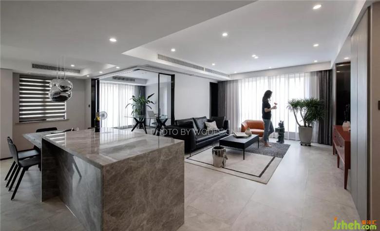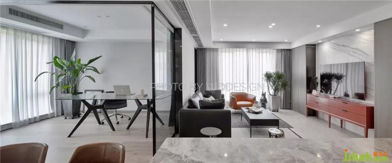 不作隔斷的餐廳、和大塊面玻璃透明書房,無實物隔斷的設(shè)計,讓整個客廳的采光條件十分優(yōu)異。也讓這個空間看起來更加開闊。裝修公司