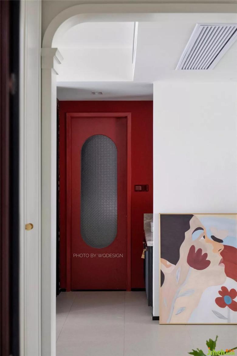 入戶望去即是布達拉宮紅門墻。長橢圓造型門洞中的定制瓦楞玻璃弱化了盥洗室門的沖突感,同時也讓玄關有了視覺錯覺感。裝修公司