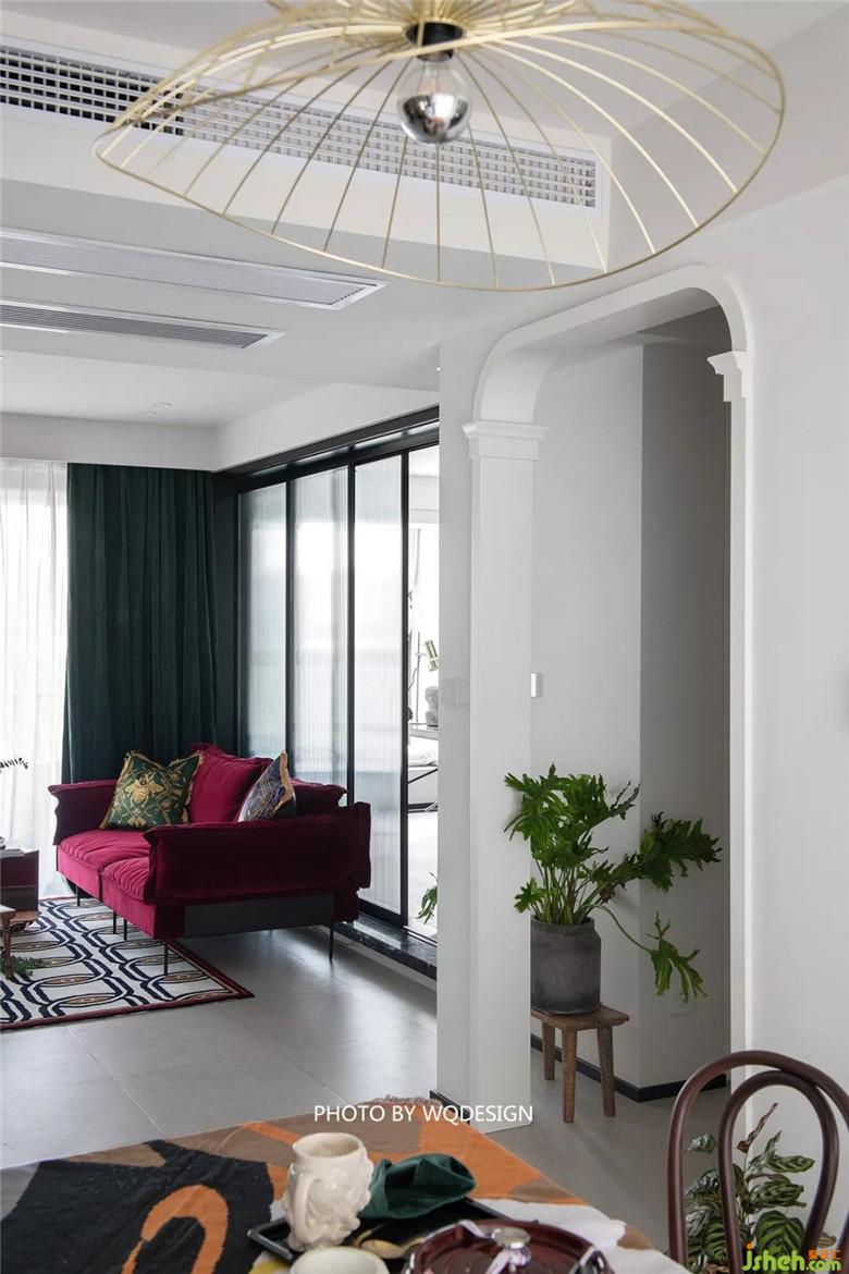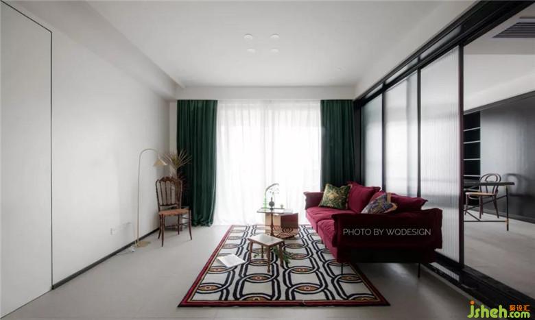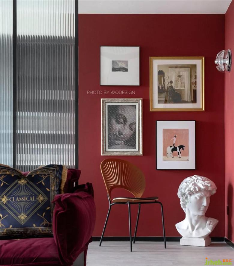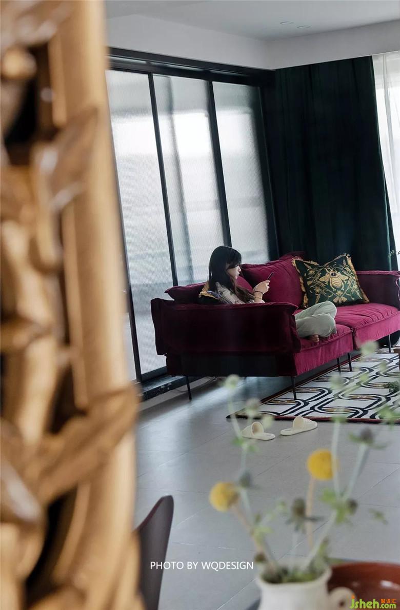 客廳沙發(fā)呼應書房的紅墻,玻璃門半開,這里就是一個小景。