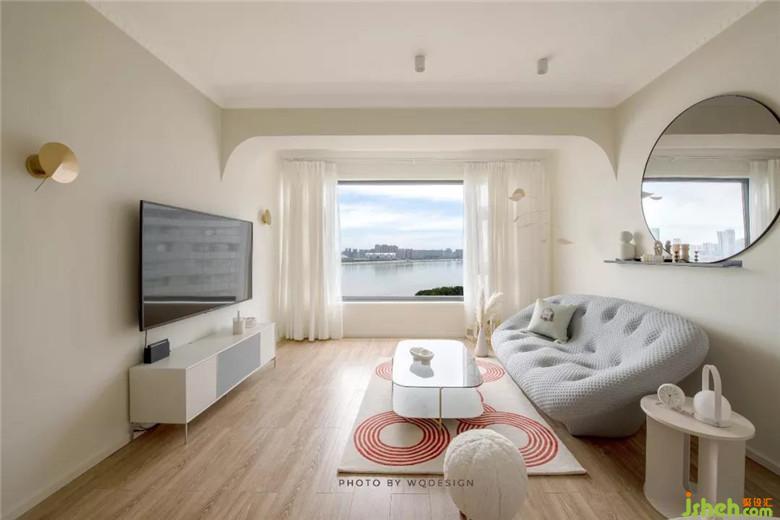 客廳處橫梁做上圓拱造型,用平面設(shè)計(jì)感將江景框住,整廳的家具都用白色系,將窗景凸顯。同時(shí),拱門造型也弱化了沙發(fā)在梁下的不妥之處。裝修公司
