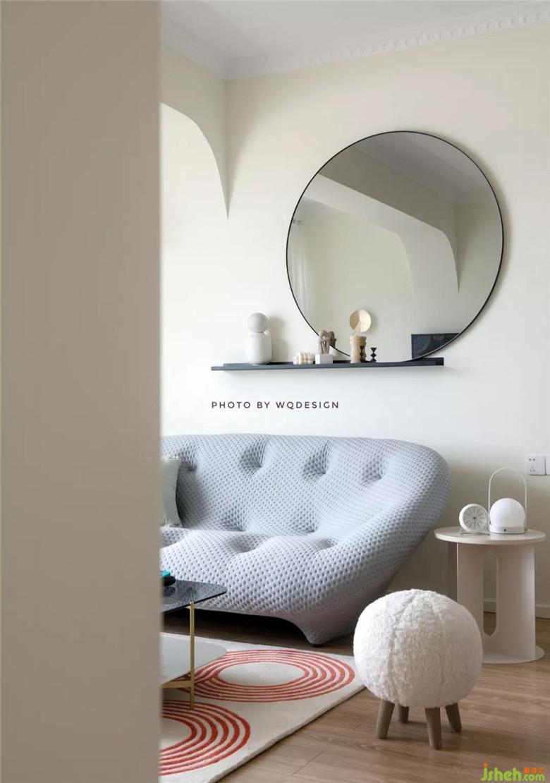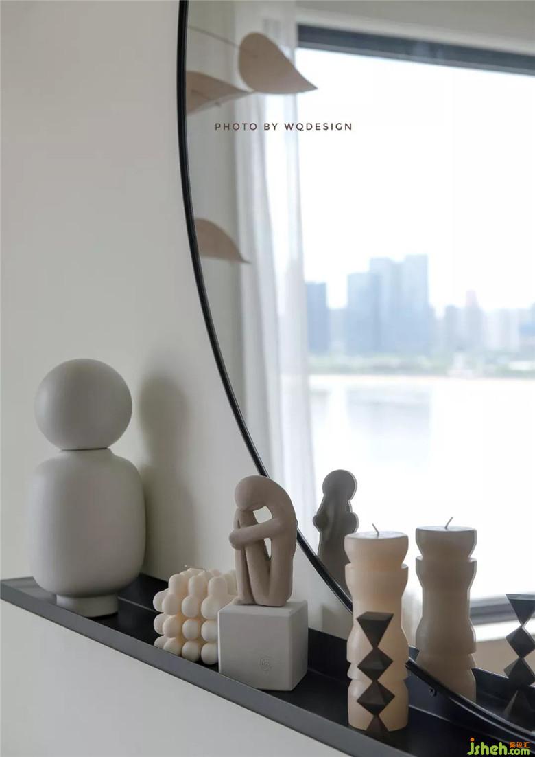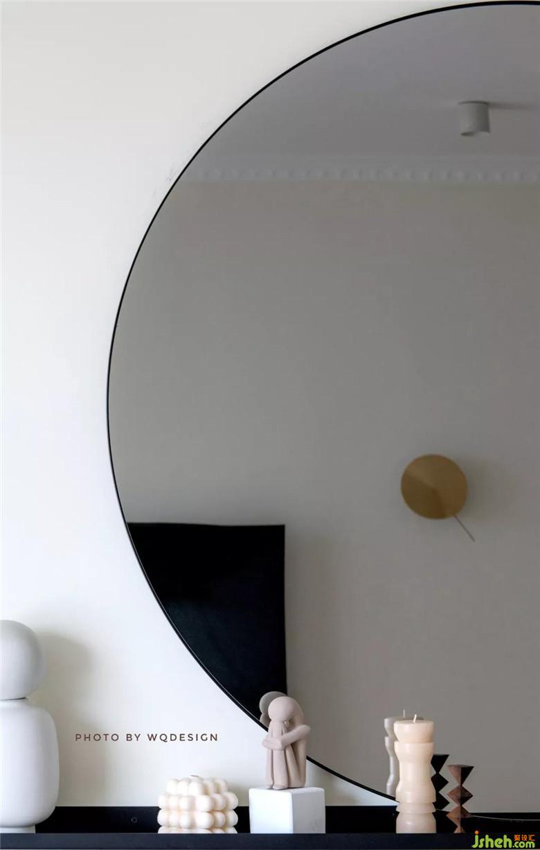 錯(cuò)落擺放裝飾物的置物臺(tái)用作客廳背景墻,著實(shí)挺特別。煙熏黑面圓鏡帶給人的視覺沖擊加上隔斷,增加不少墻面的setting。