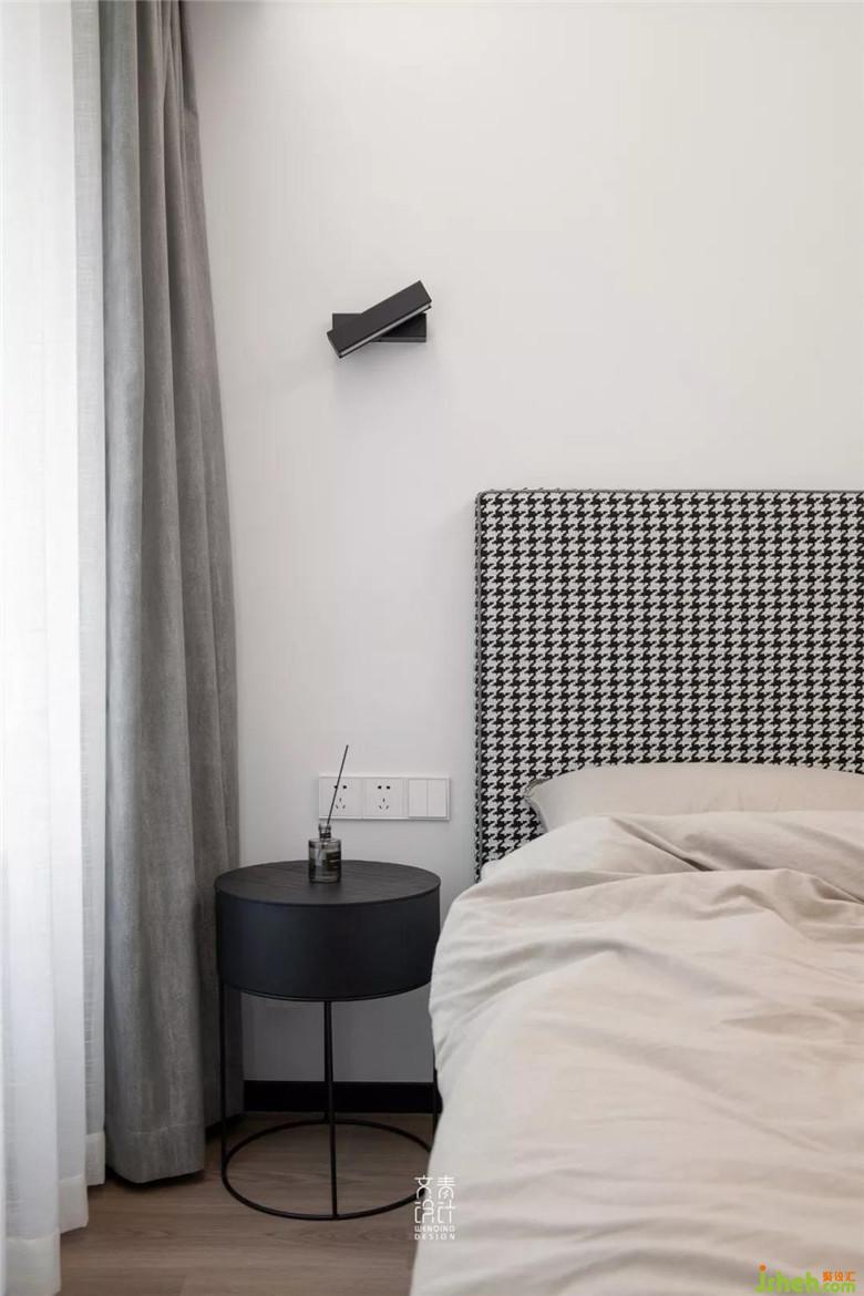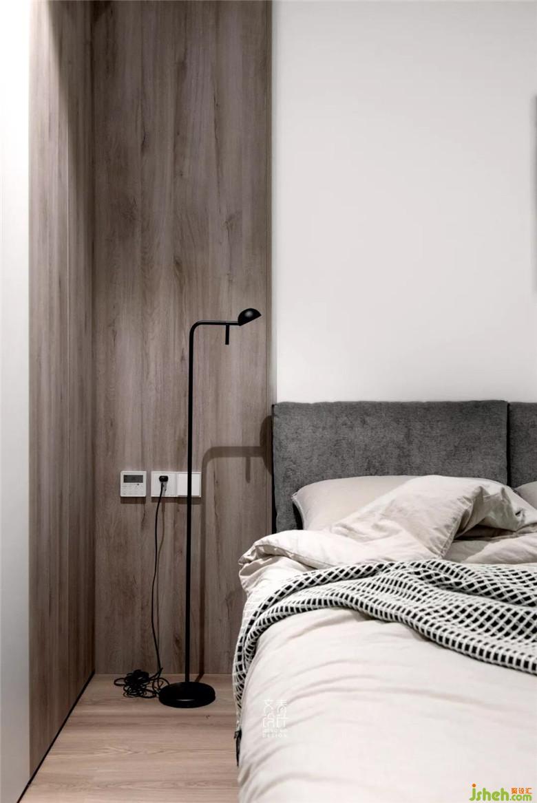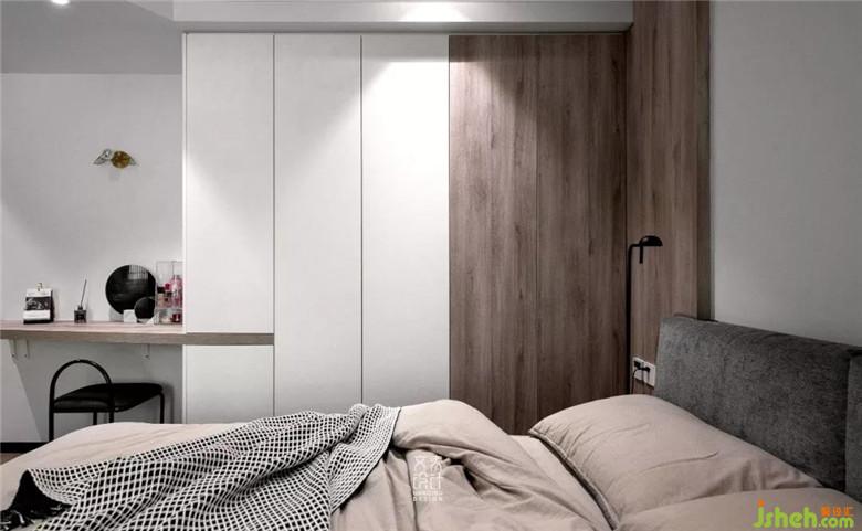女業(yè)主習(xí)慣在臥室化妝,在主臥有限的空間里,再騰出一個(gè)桌位比較困難,因而在主臥進(jìn)門處定制出一個(gè)斜桌用作梳妝臺(tái),其插入衣柜的設(shè)計(jì)也稍顯新意。