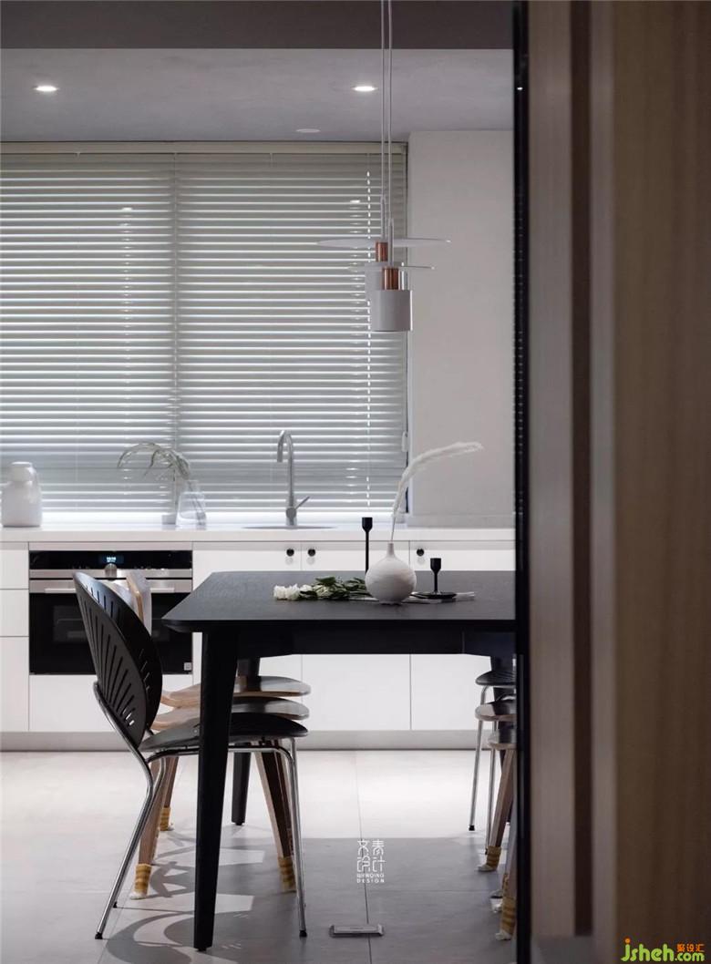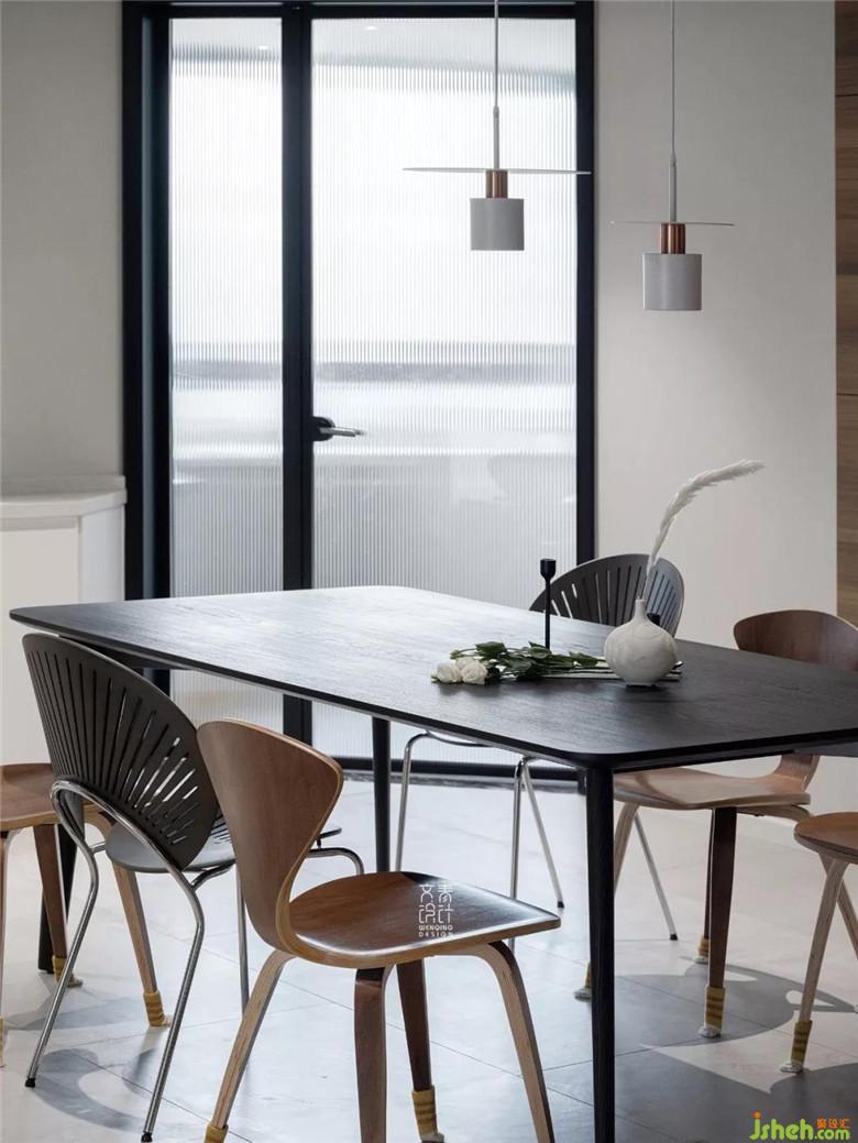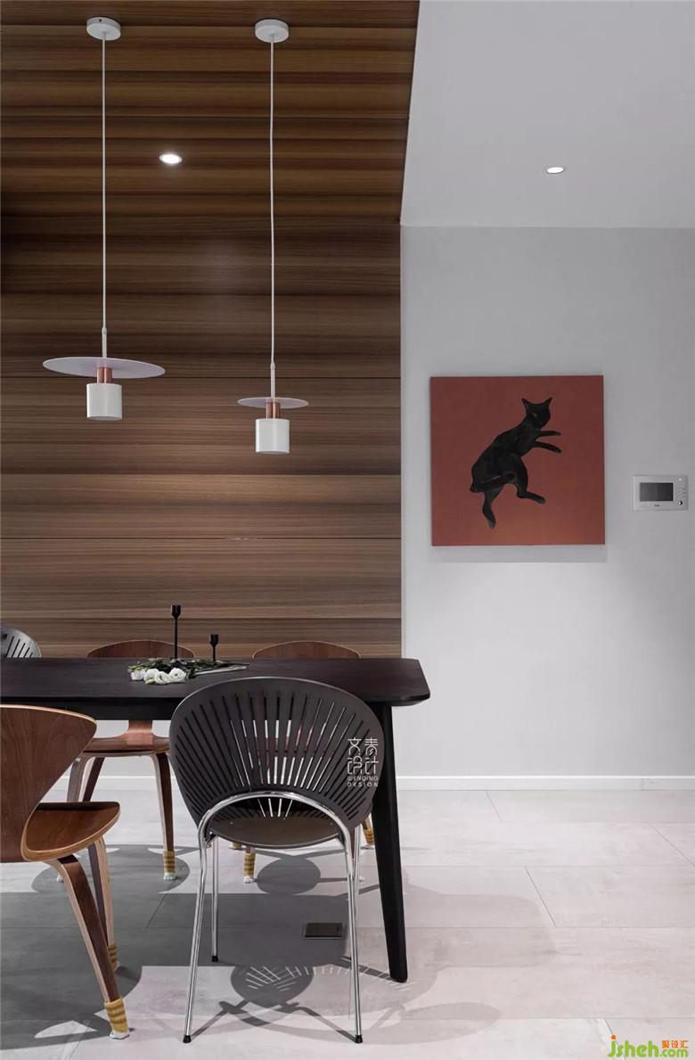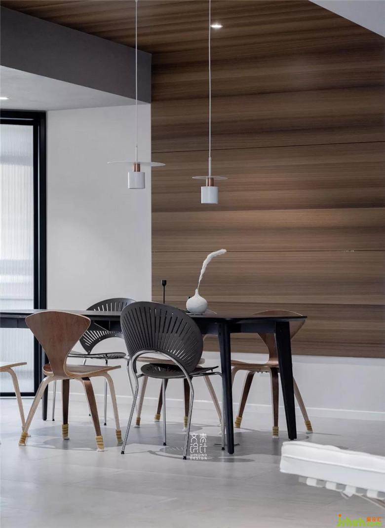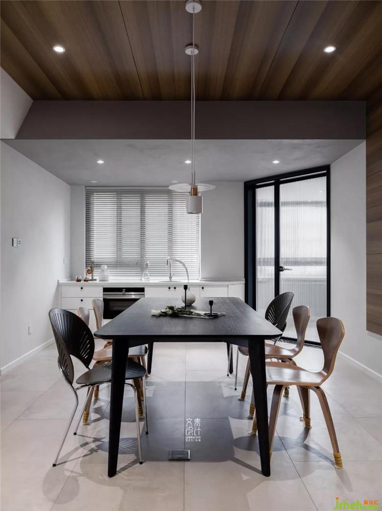 餐廳處的木飾面由墻面延伸至吊頂,其色彩和紋理線條顯得比較簡潔明快。鑲嵌在木飾面板里的筒燈,搭上開闊的空間,是開闊的展廳感。