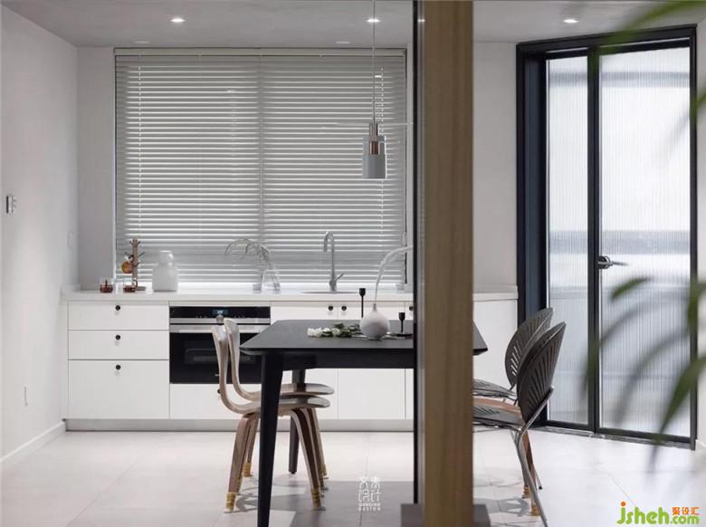 原四四方方的書房改成廚房,進(jìn)門處的墻砌成斜面,優(yōu)化行走動線,打開房門也更方便餐廳與廚房的交互。