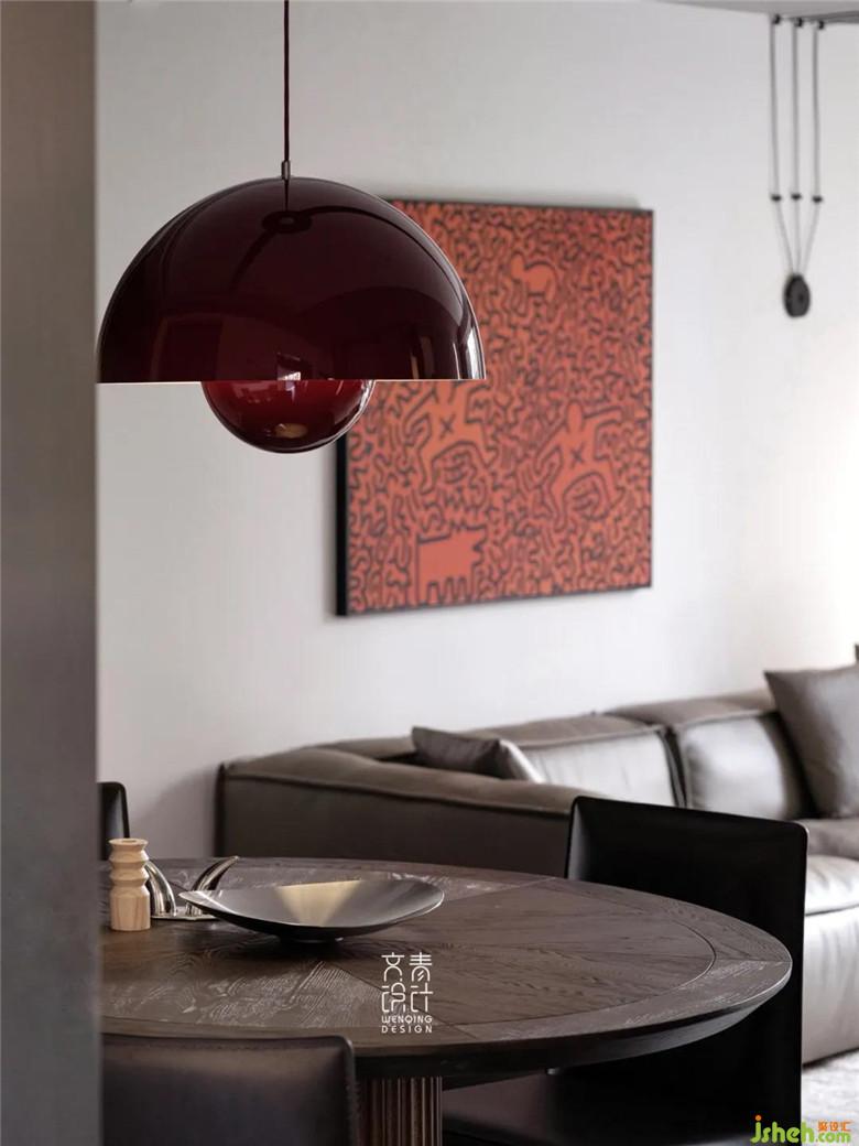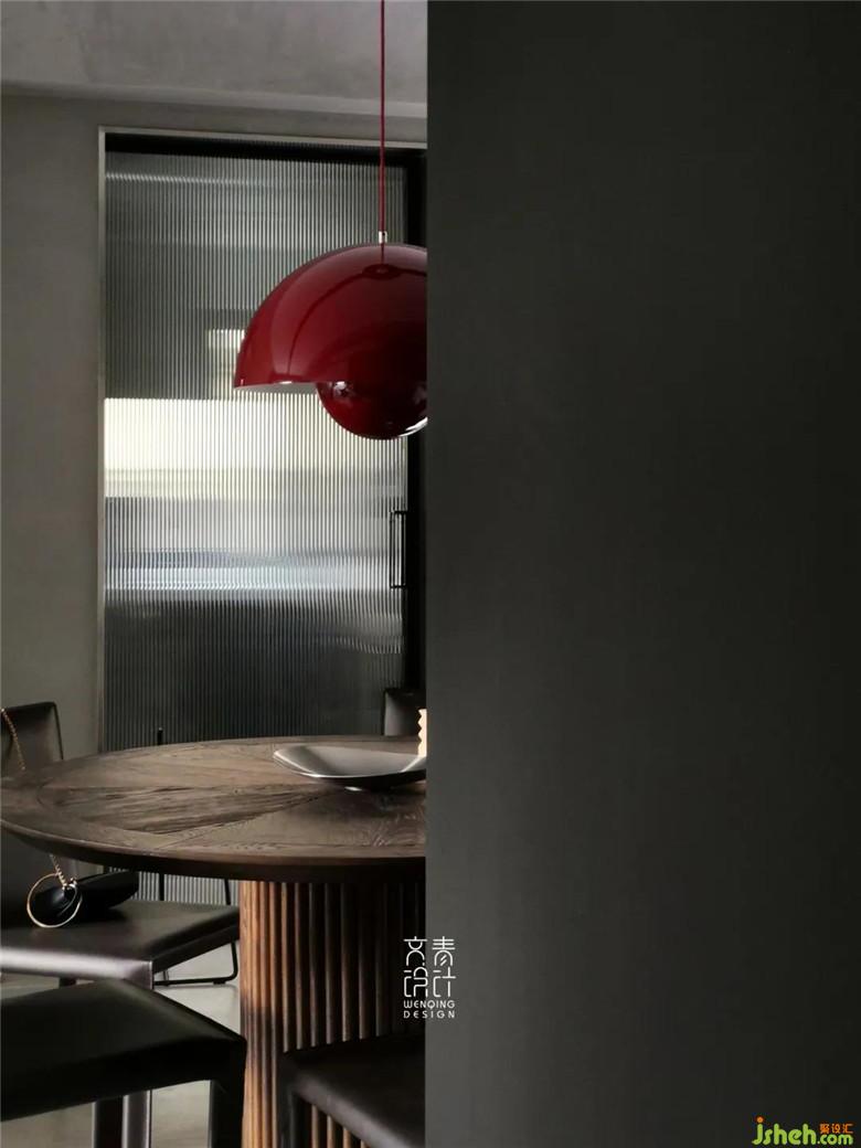 進門左手邊就是餐廳,圓餐桌自帶家庭聚餐屬性,這一方小小領(lǐng)域定是家中煙火氣最為濃郁的。