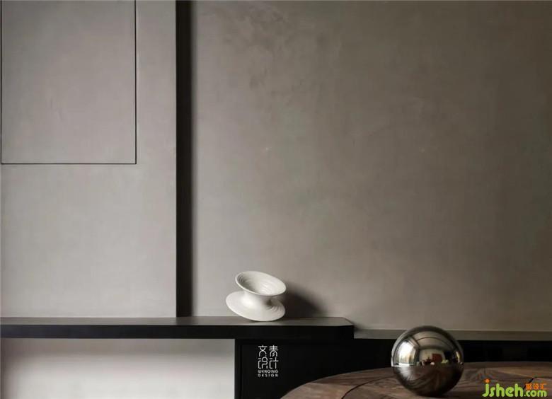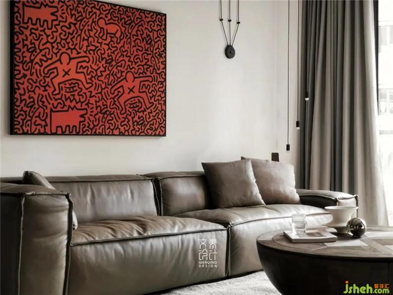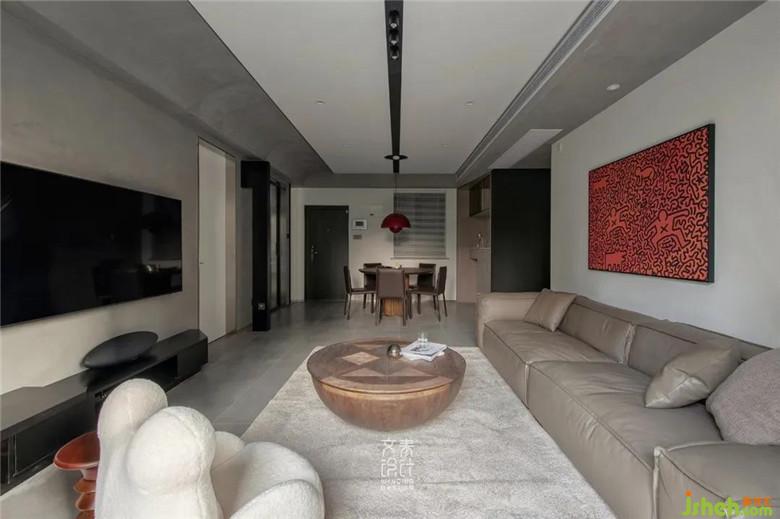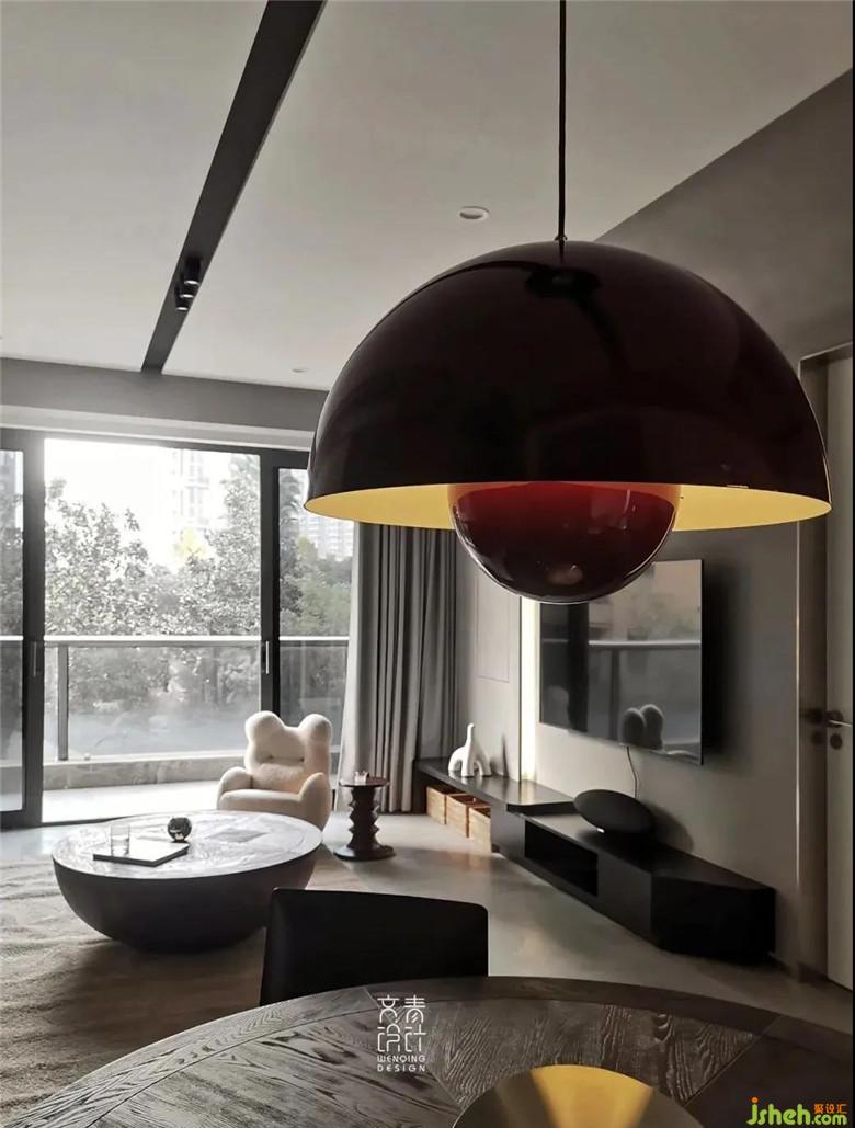 望著餐桌頂部暗紅色的圓弧吊燈,弧形燈罩與客廳吊頂完美呼應(yīng)融合,視線在不知不覺中就被帶到了客廳??蛷d不需要過多的儲物功能,長條電視機柜用來日常收納與展示, 電視機柜鏤空部門也可用作為女兒的玩具收納處。