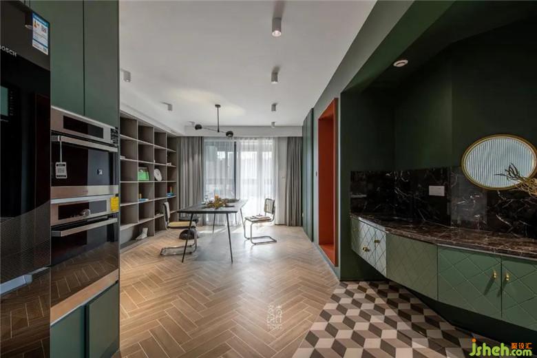墨綠色漆就的墻面,自然的將視線帶到了客廳,雖說是客廳,卻與傳統(tǒng)的客廳大不相同,沒有沙發(fā)沒有電視,只擺了一張長桌和幾張單椅。