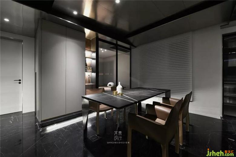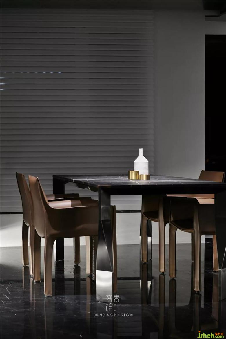 進(jìn)門后看到的第一個區(qū)域是餐廳,咖色餐椅、不銹鋼和黑色大理石材質(zhì)的餐桌,裝修公司讓空間黑色和金屬元素進(jìn)行到底。餐廳吊頂也是不銹鋼材質(zhì)吊頂,鋼本色。