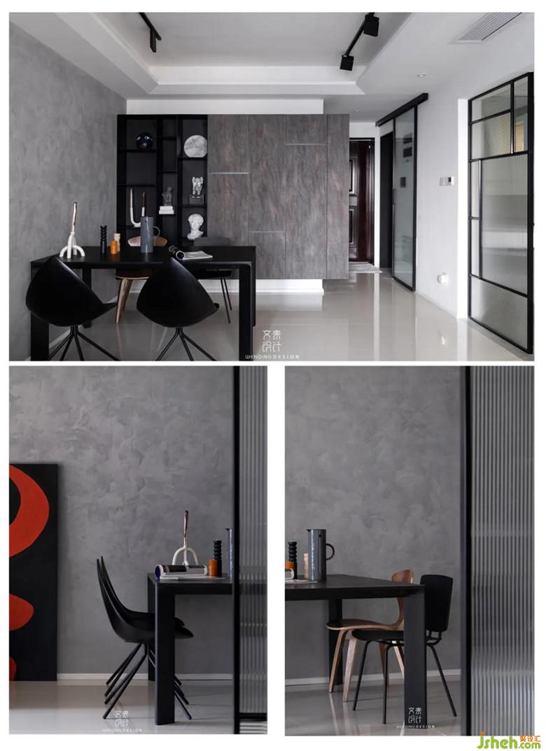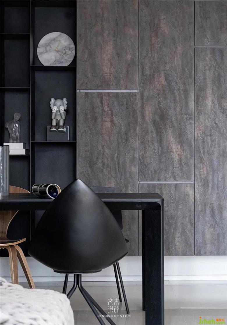 裝修公司設(shè)計(jì)滿墻的收納柜又兼顧了實(shí)用與顏值,收納柜的開(kāi)放空間可以用來(lái)展示主人的收藏品,全封閉的空間又給雜物提供了“藏身之地”,水滴型的椅背給充滿硬朗線條的空間帶去一絲柔和。