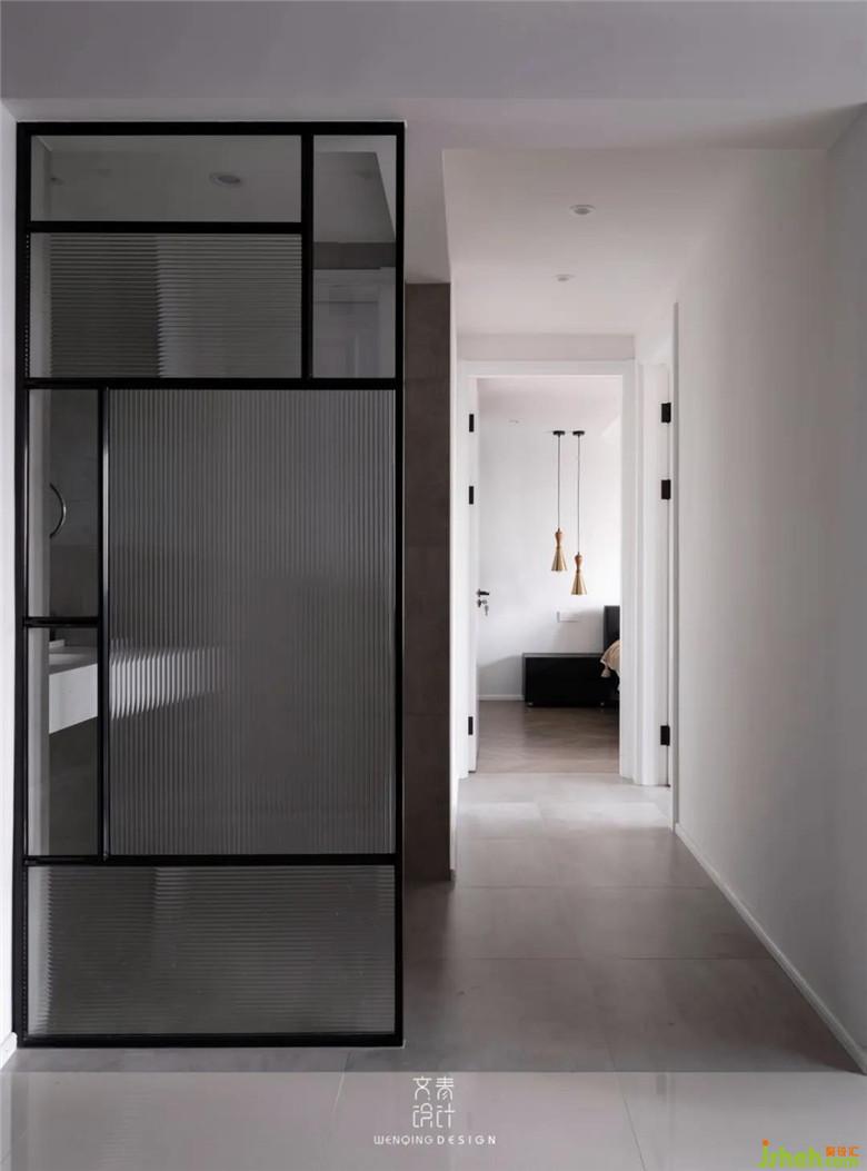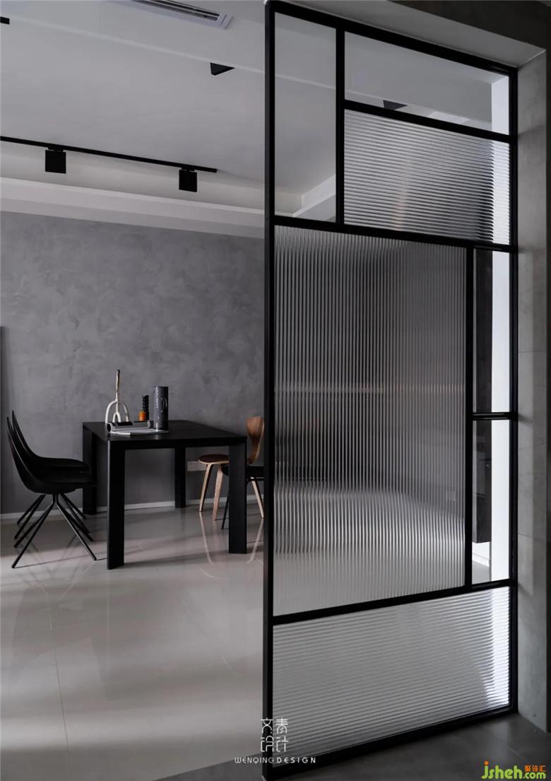 在客廳的功能分區(qū)上,玻璃隔斷發(fā)揮了大作用,不僅分隔出了干區(qū),還通過鏡像反射了環(huán)境,讓空間從視覺上變得更寬敞。