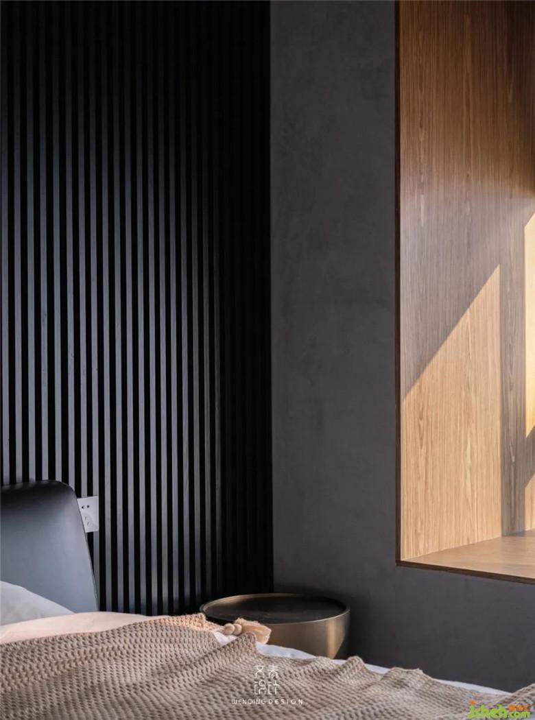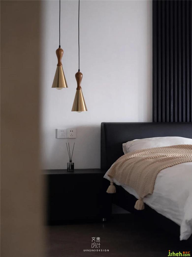 業(yè)主是一個(gè)人居住,所以原始戶型的小書房被改成了走入式衣帽間,整體舒適性得到了提升,主臥的空間也會(huì)更大,床背景的格柵裝修公司并沒有采用滿墻的形式,而是用吊燈來營(yíng)造視覺上的設(shè)計(jì)感與平衡感。