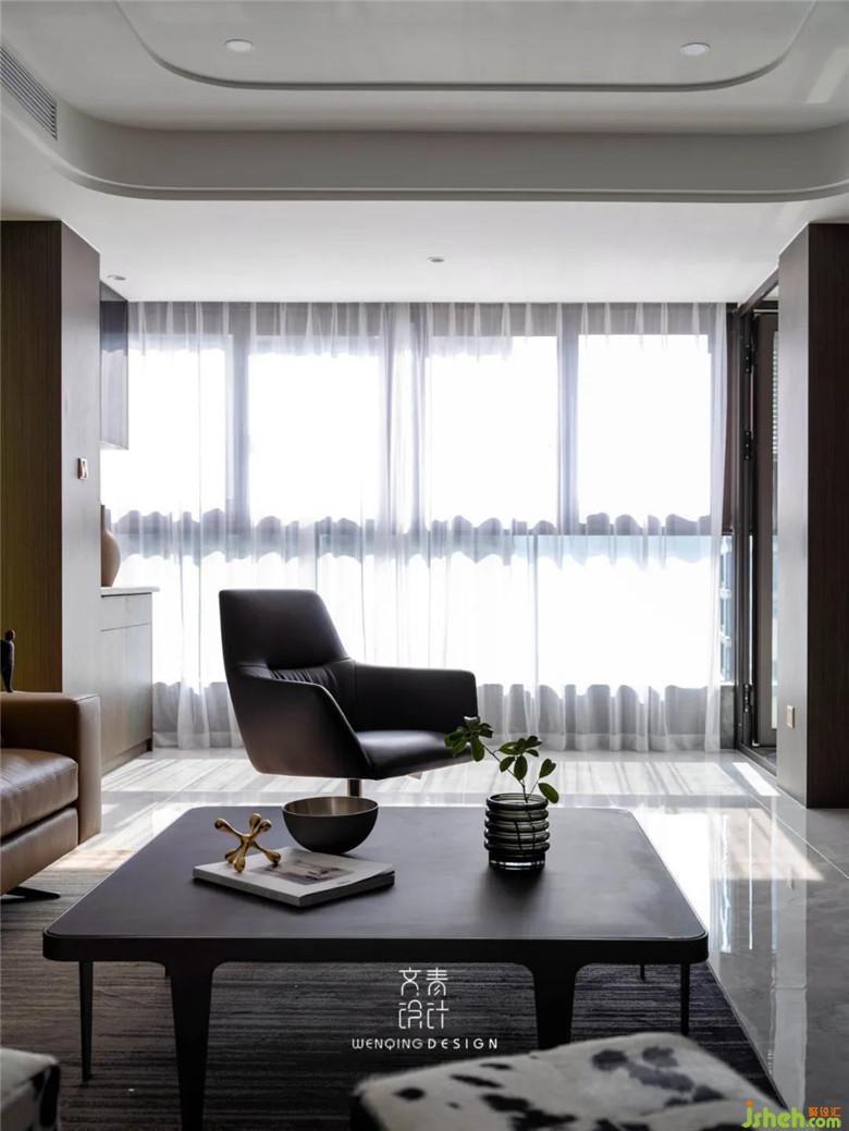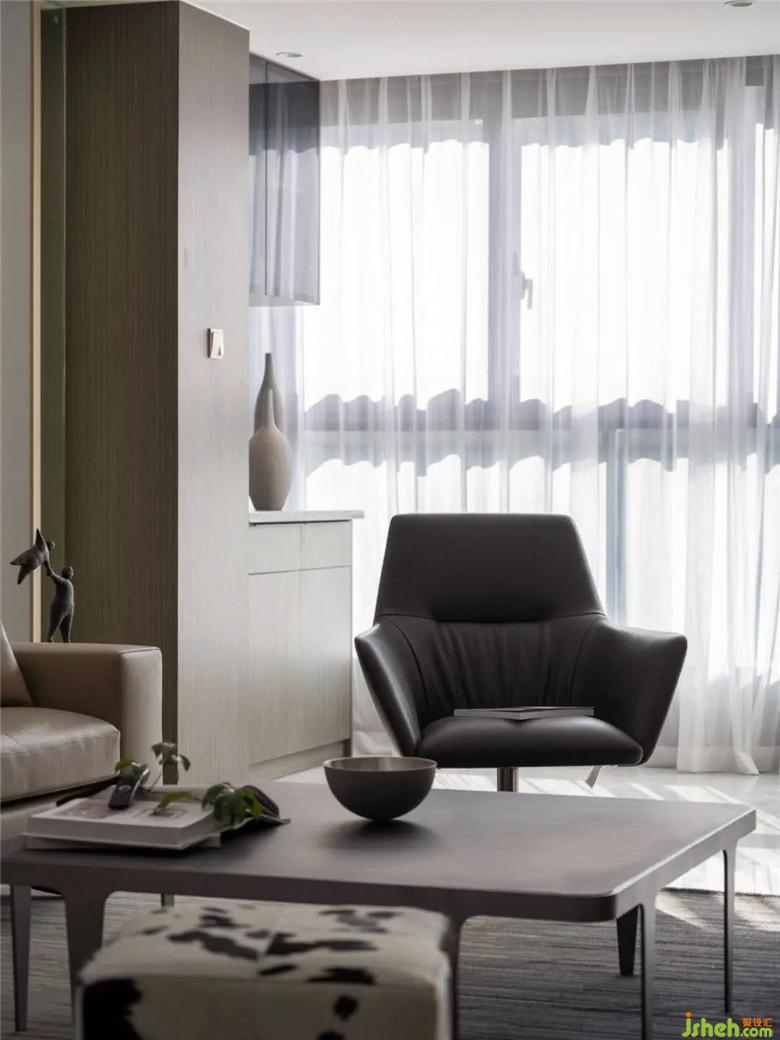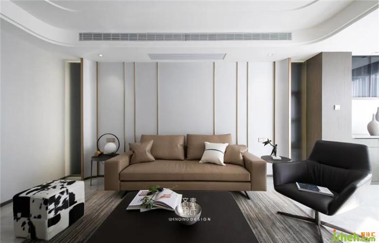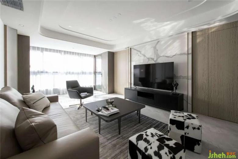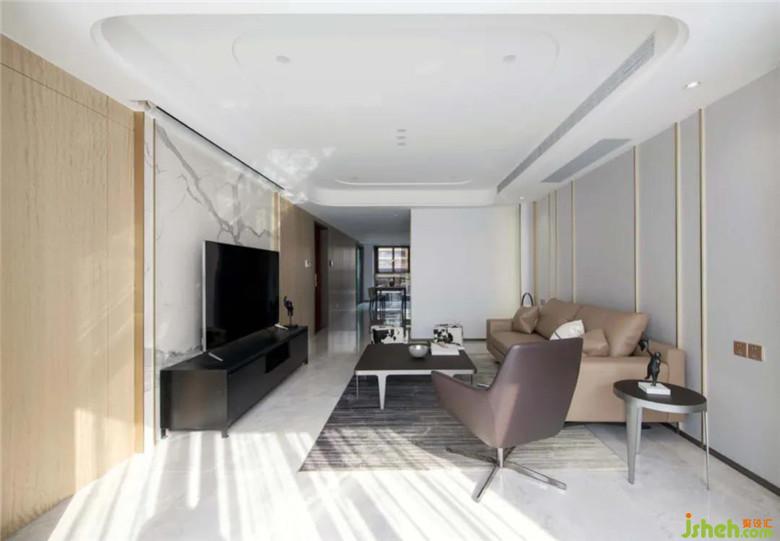 沙發(fā)背景兩邊也做了圓弧形收口,和吊頂?shù)膱A弧遙相呼應(yīng)。