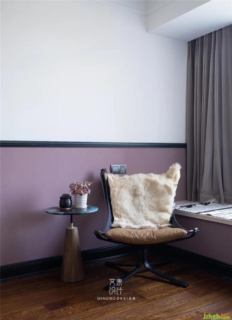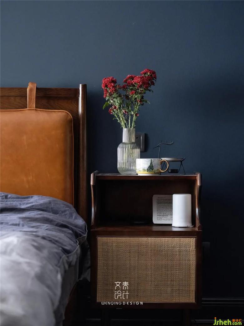 臥室裝修公司采用了海軍藍(lán)與淺玫瑰色的一個(gè)撞色,似不太搭的兩個(gè)色彩,組合起來卻有著奇妙的化學(xué)反應(yīng)。為了讓兩個(gè)顏色不顯得突兀,我們降低了顏色飽和度,并現(xiàn)場根據(jù)業(yè)主家不同的光線現(xiàn)場進(jìn)行略微的調(diào)色。