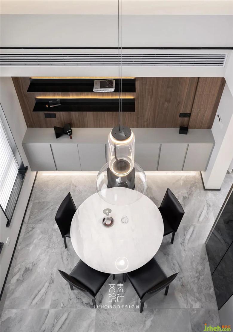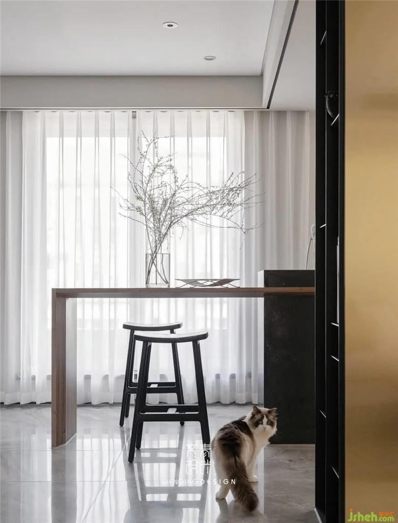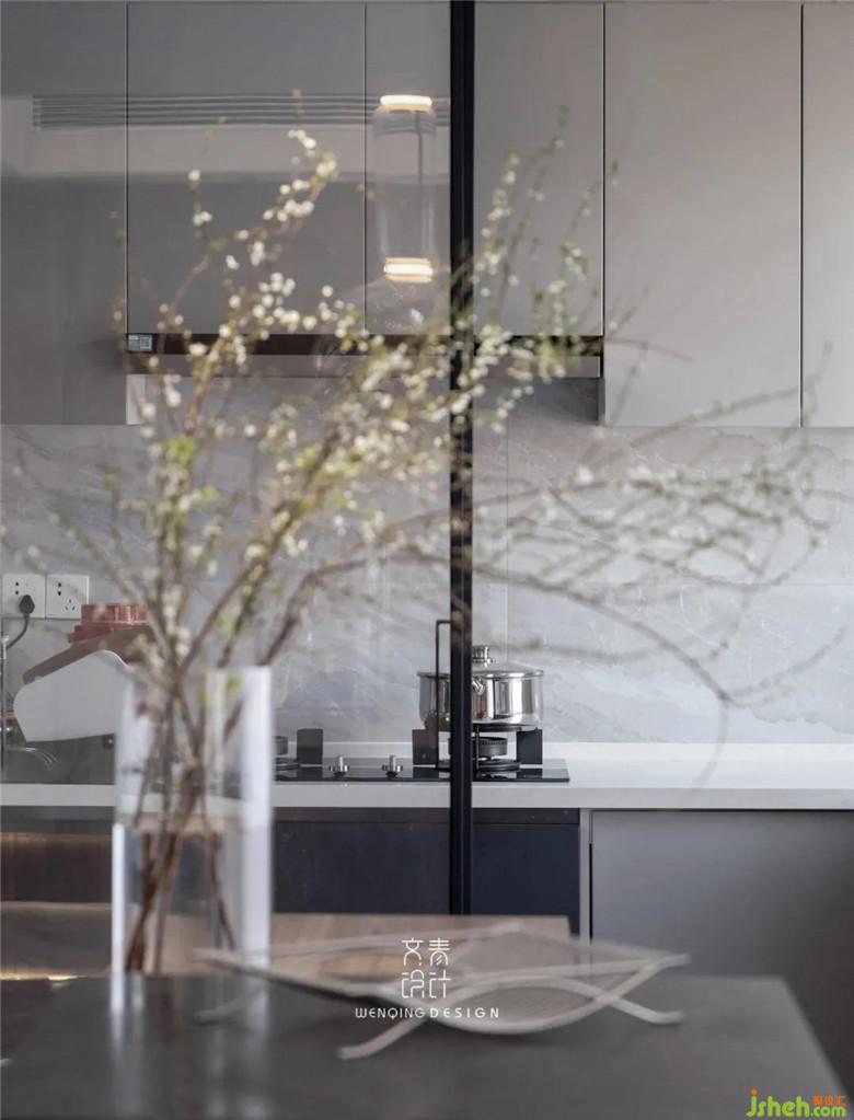 餐廳與客廳之間只用了電視背景墻來(lái)簡(jiǎn)單隔斷,廚房裝修公司也采用了窄框玻璃門(mén),將線條與簡(jiǎn)約貫穿了整個(gè)一樓空間,吧臺(tái)的設(shè)計(jì)使得一個(gè)人在家用餐時(shí)也不會(huì)覺(jué)得那么空曠,反而多么一絲隨性。