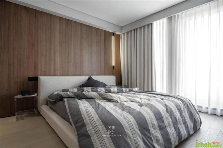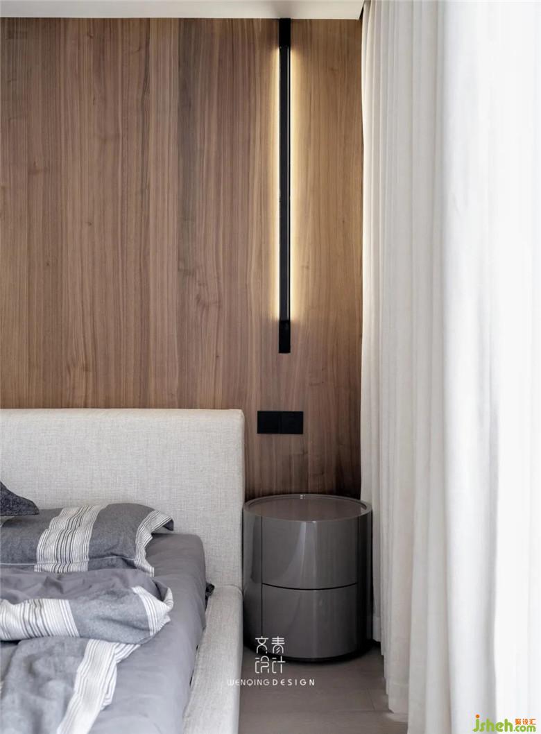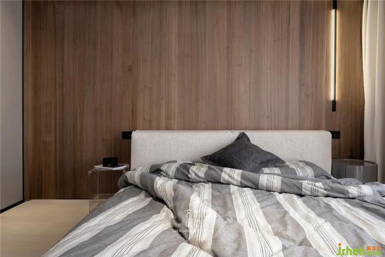 主臥配備了業(yè)主日常實(shí)用的衣柜,整個(gè)色調(diào)采用了一樓相互呼應(yīng)的黑金配色,床背景采用了格柵來(lái)裝飾,也與外圍過(guò)道的格柵能有連接感。