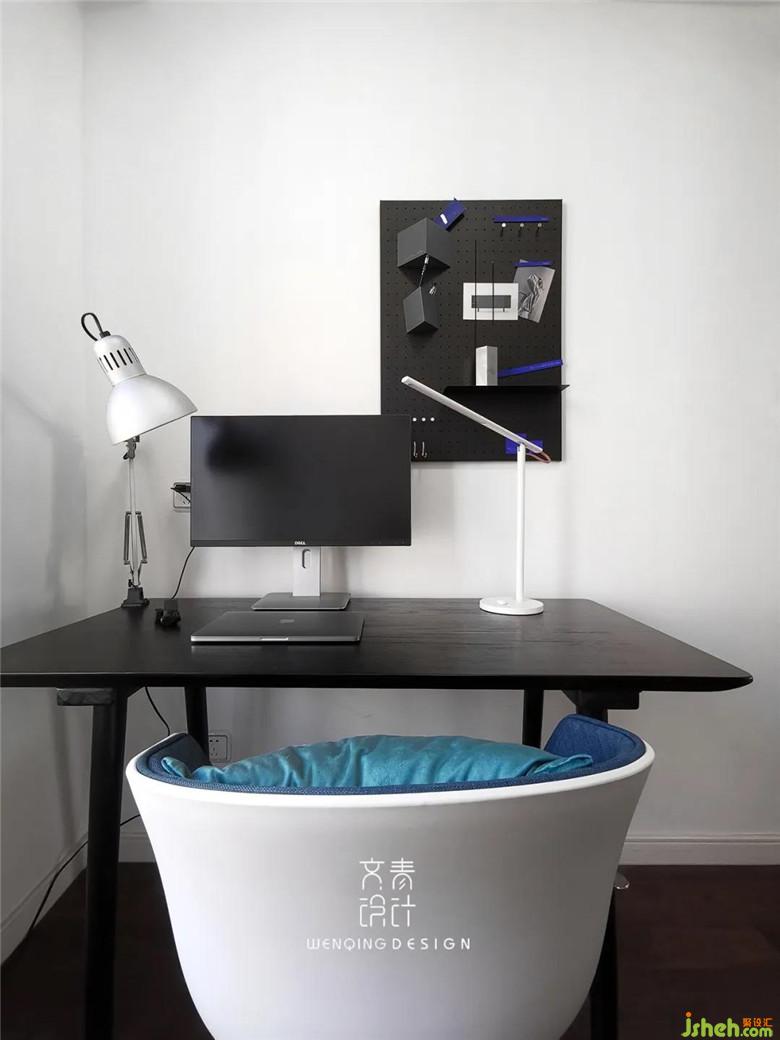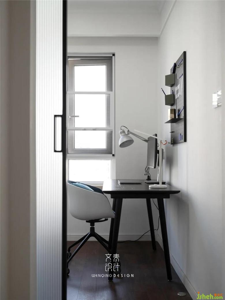 原本書房是開門,為了滿足家庭的日常儲物功能,裝修公司將開門改成移門,滿足男主人的辦公區(qū)域后,還增加了女主人的衣帽間功能,拐角區(qū)域利用原始結(jié)構(gòu)劃分出了書柜+鞋柜的功能。