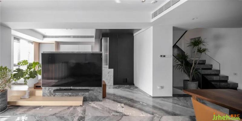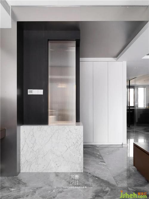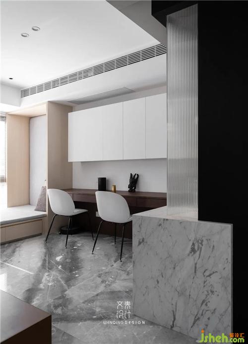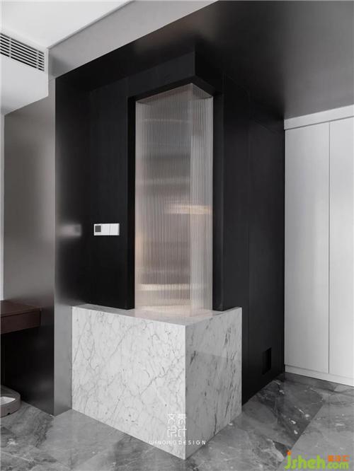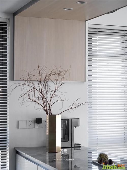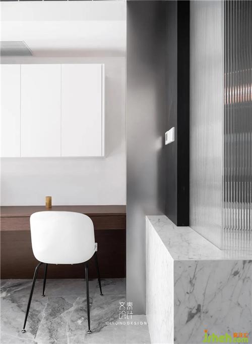 書房旁的公衛(wèi)采用不銹鋼吊頂,獨樹一幟的設(shè)計,往往能讓人眼前一亮,不銹鋼材質(zhì)從頂延伸至墻面,與木飾面、玻璃和大理石形成材質(zhì)反差,讓視覺直觀體驗到設(shè)計的碰撞感。