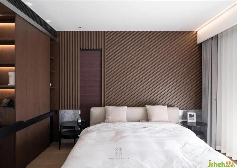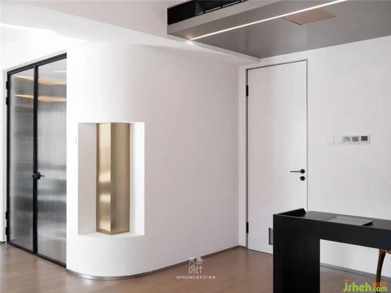 主臥進(jìn)門處吊頂延續(xù)不銹鋼材質(zhì),門框、踢腳線也運用相同材質(zhì)延伸,營造設(shè)計延展統(tǒng)一性。轉(zhuǎn)角處的直墻采用圓角處理,減弱直墻硬朗線條的沖突感,中部鏤空嵌入金屬裝置,用剛?cè)岵?jì)四字形容足以。