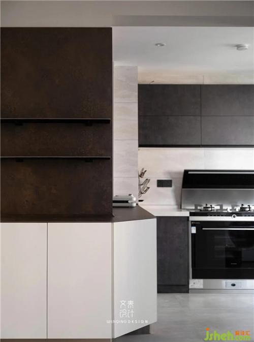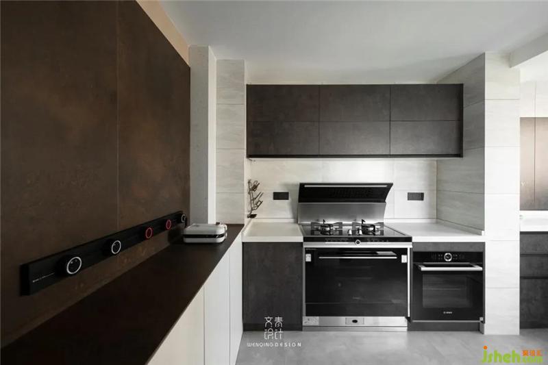 廚房操作臺(tái)面被墻體分成兩段,延伸進(jìn)廚房的儲(chǔ)物柜,剛好彌補(bǔ)了這一缺陷。墻面安裝可隨意移動(dòng)軌道插座,滿足小廚電使用。