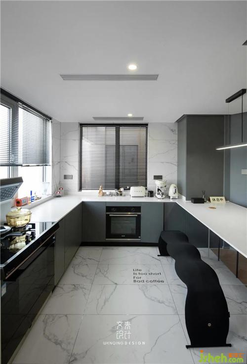 原本入戶(hù)是局促的廚房空間,我們敲掉廚房與書(shū)房的隔墻,做成開(kāi)放式餐廚空間,這樣廚房就能擁有三面窗,擴(kuò)大使用空間和采光面積杭州裝修設(shè)計(jì)。