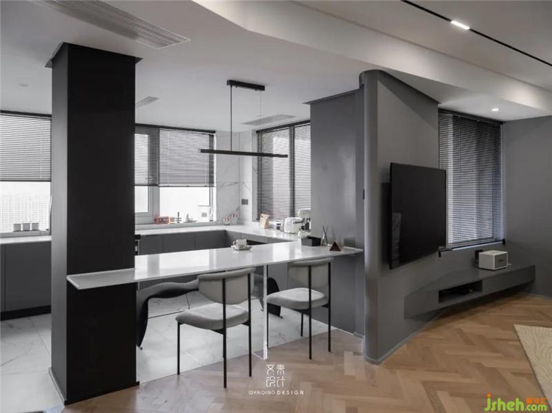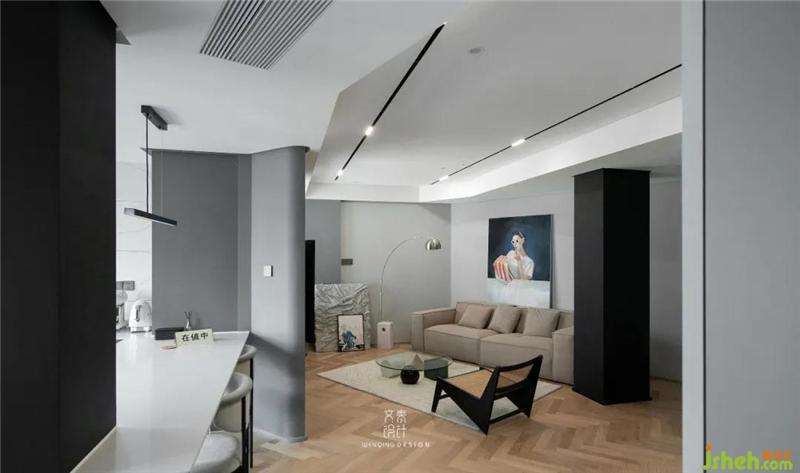 全開(kāi)放式空間看久了會(huì)沒(méi)有視覺(jué)焦點(diǎn),這時(shí)不能拆除的承重柱起了作用,通過(guò)空間中梁的強(qiáng)調(diào),來(lái)表達(dá)一種空間氣質(zhì),同時(shí)在梁與吊頂接口處拉槽燈帶的方式,使得梁有一種空間層高延伸感。