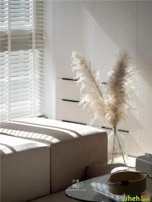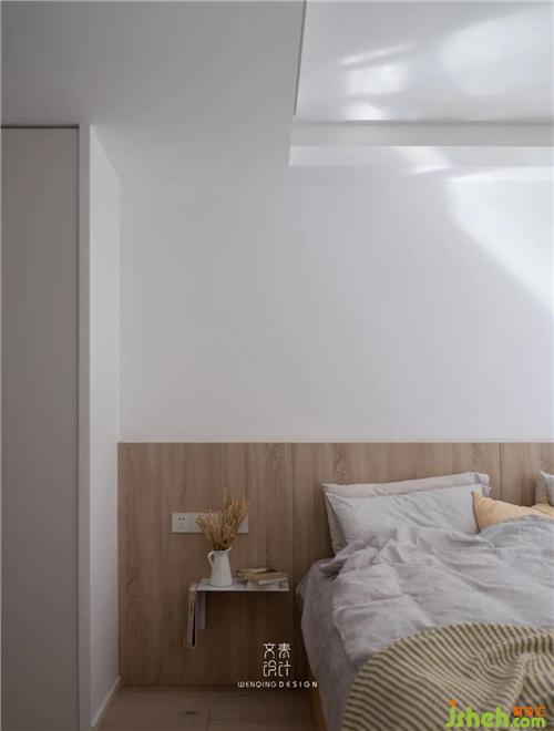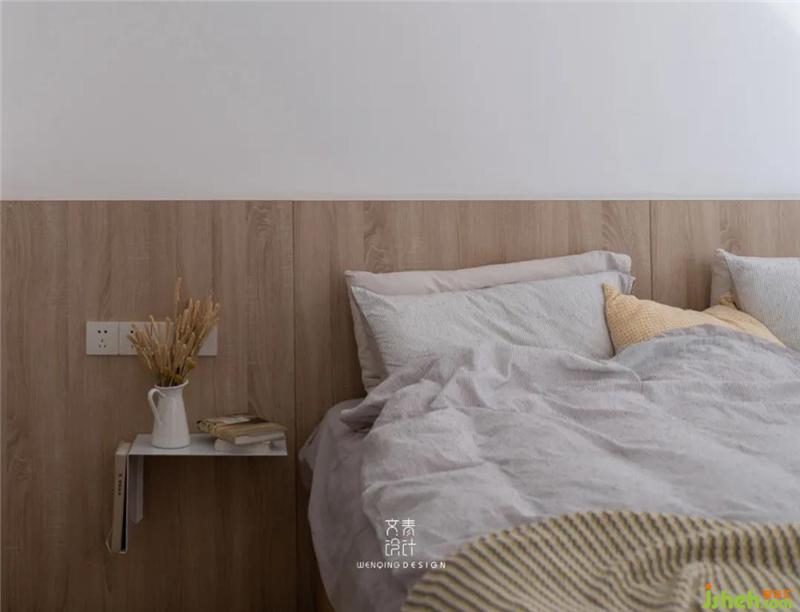 臥室延續(xù)客廳設(shè)計(jì)風(fēng)格,原木與暖白兩色交織,讓臥室的氛圍回歸安靜舒適。采用鐵藝置物架代替?zhèn)鹘y(tǒng)床頭柜,放上幾本睡前讀物,杭州裝修設(shè)計(jì)睡前也能滿足精神食糧。