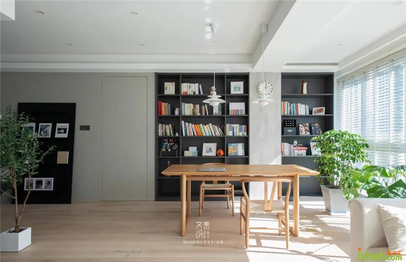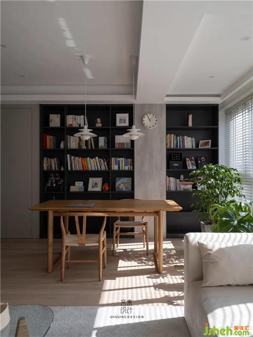 客廳另一側(cè)則改造成家中的開放式書房,我們將墻體往主臥內(nèi)推,定制內(nèi)嵌式開放書柜,原本突兀的承重柱,剛好切斷滿墻書柜的壓抑感,創(chuàng)造了視覺上的呼吸點(diǎn)。