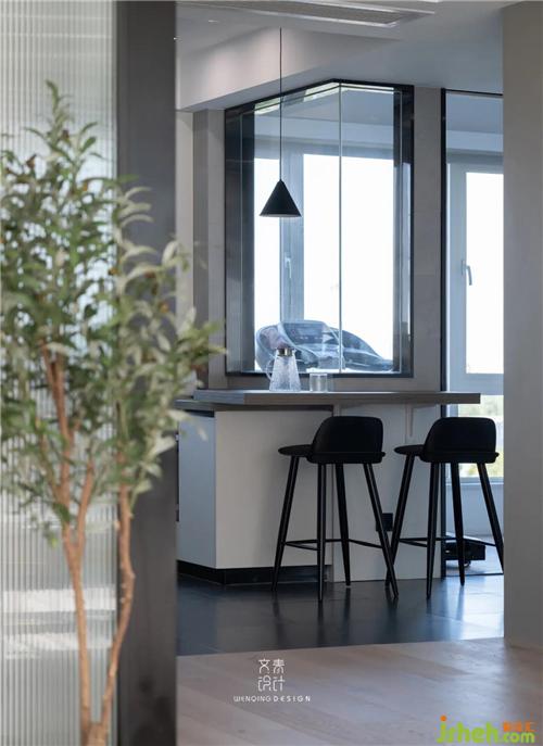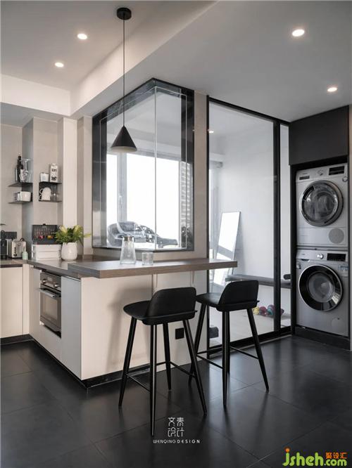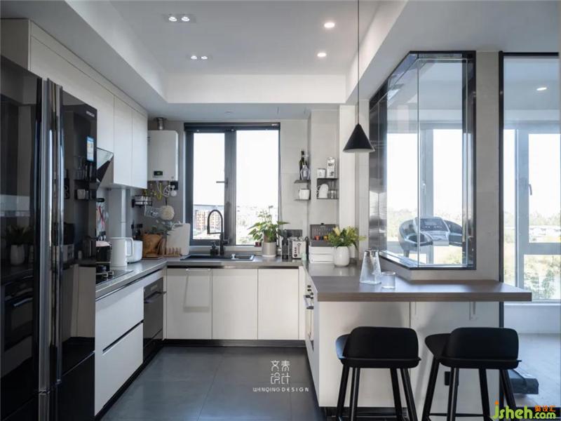 健身房與廚房僅一玻之隔,借助玻璃的通透性增加廚房采光性,在吧臺用餐時(shí)也能欣賞窗外的風(fēng)景,視覺味覺雙滿足。