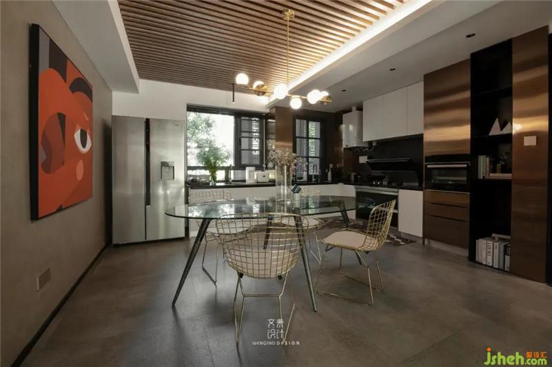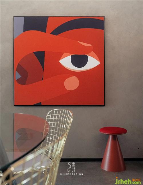 餐廳邊上布置了干區(qū)洗手臺,墻面充滿水泥質(zhì)感的藝術(shù)涂料,讓空間更硬朗,但灰色與柔和暖黃