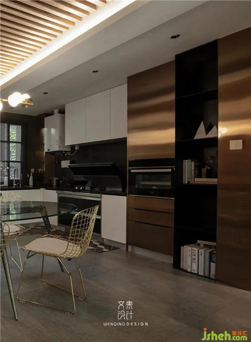 入戶就能看到餐廳空間,金色不銹鋼裝飾的高柜與餐椅遙相呼應(yīng),吊頂同樣采用了錯層設(shè)計,兩邊較低的部分剛好可以隱藏?zé)魩?,中間部分用木作營造線條感,視覺上也能得到拉伸。