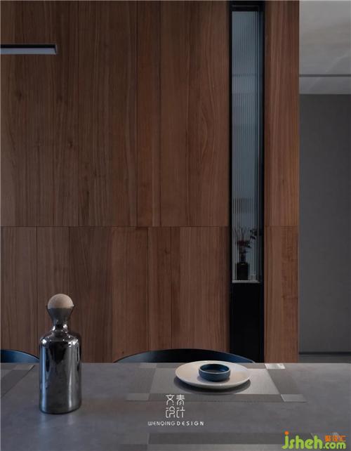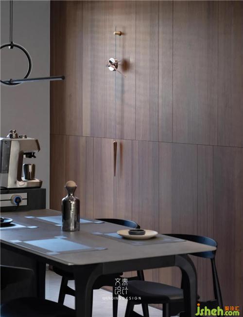 溫潤(rùn)的木飾面浸潤(rùn)整個(gè)空間,深灰的餐桌如同林中磐石,所有造型,材質(zhì),光線都在設(shè)計(jì)的交融下回歸自然,一種壓倒性的溫暖質(zhì)感,在空間中慢慢暈開(kāi)。