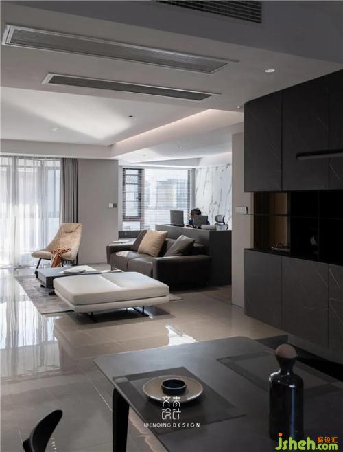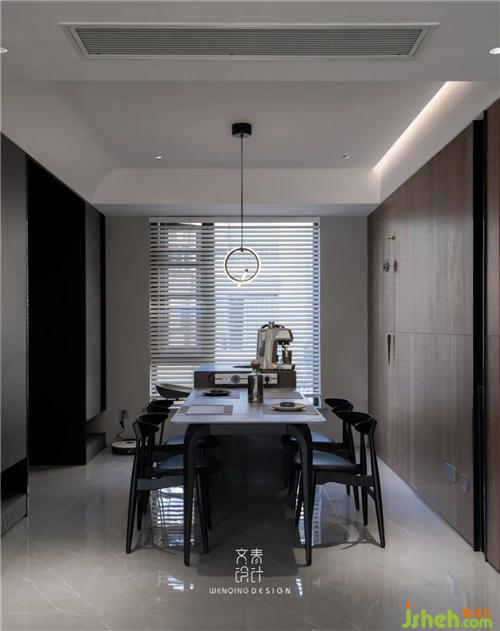 入戶鞋柜作為空間視覺(jué)轉(zhuǎn)折點(diǎn),讓空間之間的過(guò)渡更柔和??紤]到餐廳的采光,運(yùn)用百葉簾對(duì)光線的折射,營(yíng)造光學(xué)美感。
