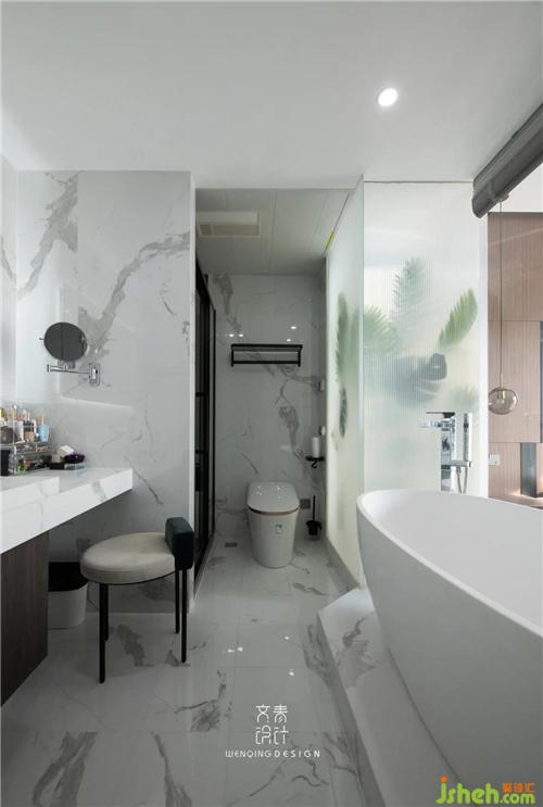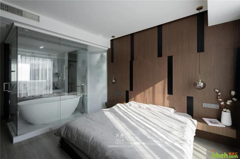 主臥延續(xù)木飾面背景設(shè)計(jì),柔和的底色給人舒緩之感,設(shè)計(jì)風(fēng)格鮮明的主衛(wèi)和綠植景觀,與柔和的底色形成鮮明的視覺(jué)反差,也成了臥室中的點(diǎn)睛之筆杭州裝修設(shè)公司。