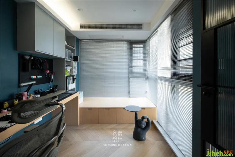 玻璃電視背景墻推門而入,就是業(yè)主平時(shí)工作休閑的書房。