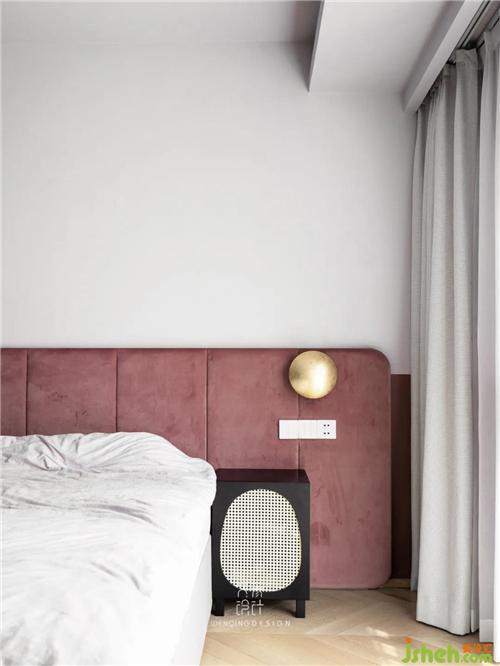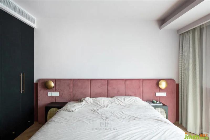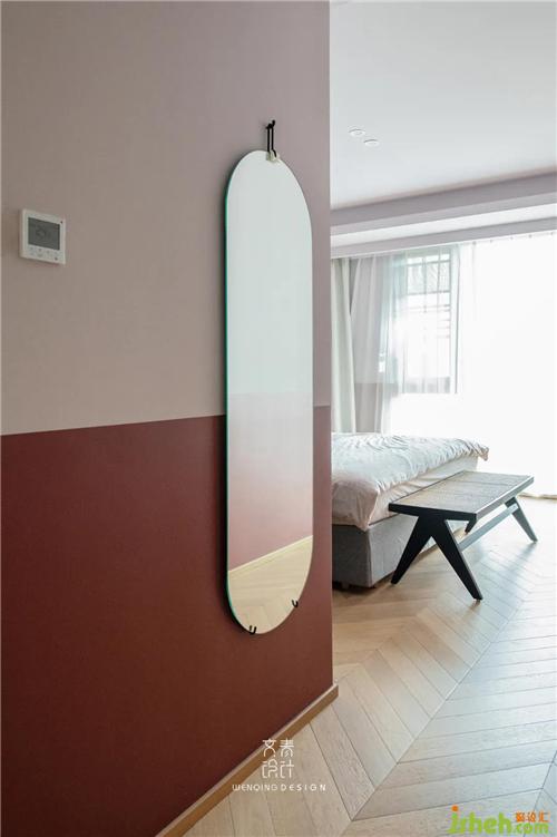 臥室用磚紅色乳膠漆刷至半墻,與床靠背交錯(cuò)所產(chǎn)生的視覺變化,仿佛在寧靜的空間中,杭州裝修公司注入了些許層次豐富的變化。