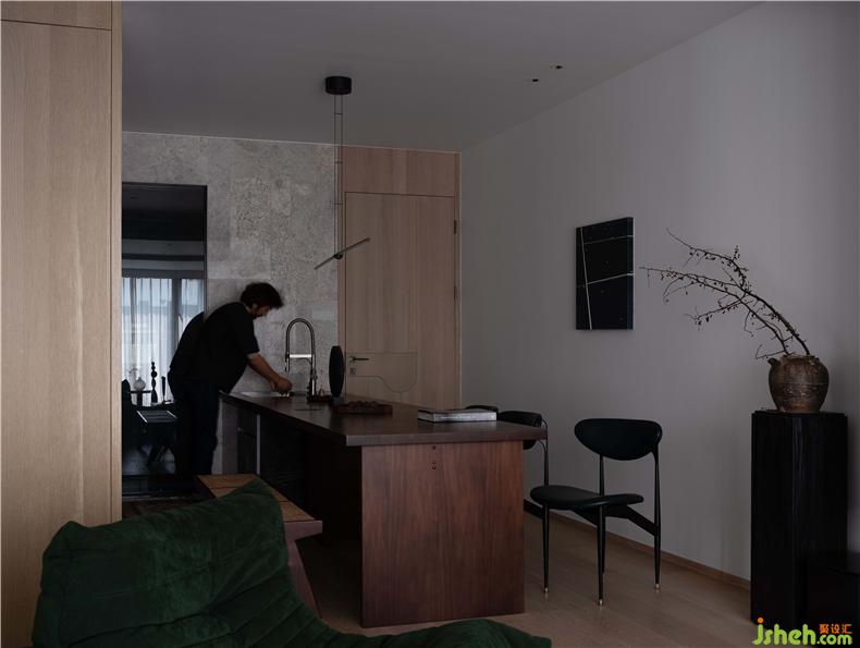 廚房的操作臺外移,與餐桌結(jié)合在一起,形成長達3米7的大長桌,不僅可以洗菜備餐,更可以作為吧臺、餐桌甚至辦公桌使用。長桌如同廚房的紐帶,與其他空間自然相連,消除了空間區(qū)域性的阻隔,將美食與生活串聯(lián)。在這里,不僅可以與朋友隨時暢享“偷得浮生半日閑”的下午茶時光,還可以在準(zhǔn)備美食的期間,與家人進行親密交流和互動。